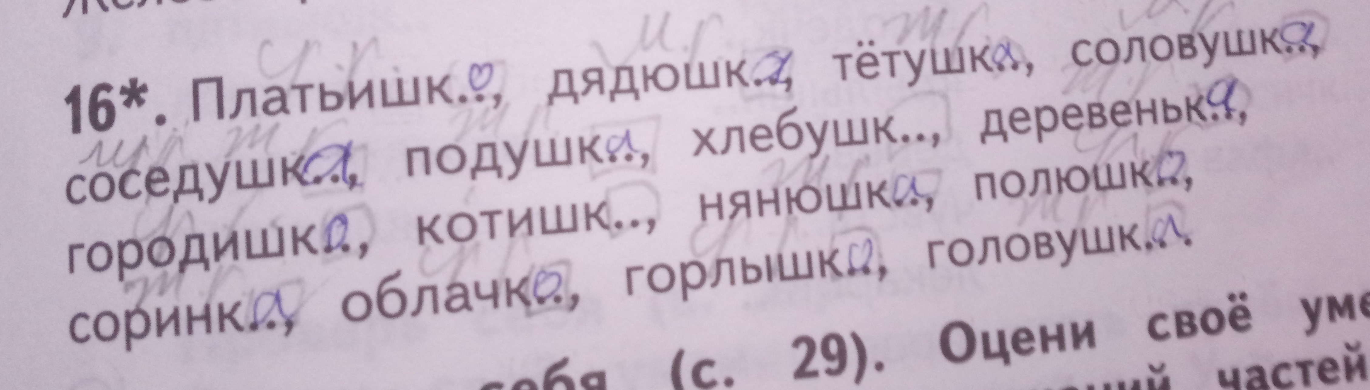 Платьишко, дядюшка, тётушка, соловушка, соседушка, подушка, хлебушка, деревенька, городишко, котишка, нянюшка, полюшка, соринка, облачко, горлышко, головушка