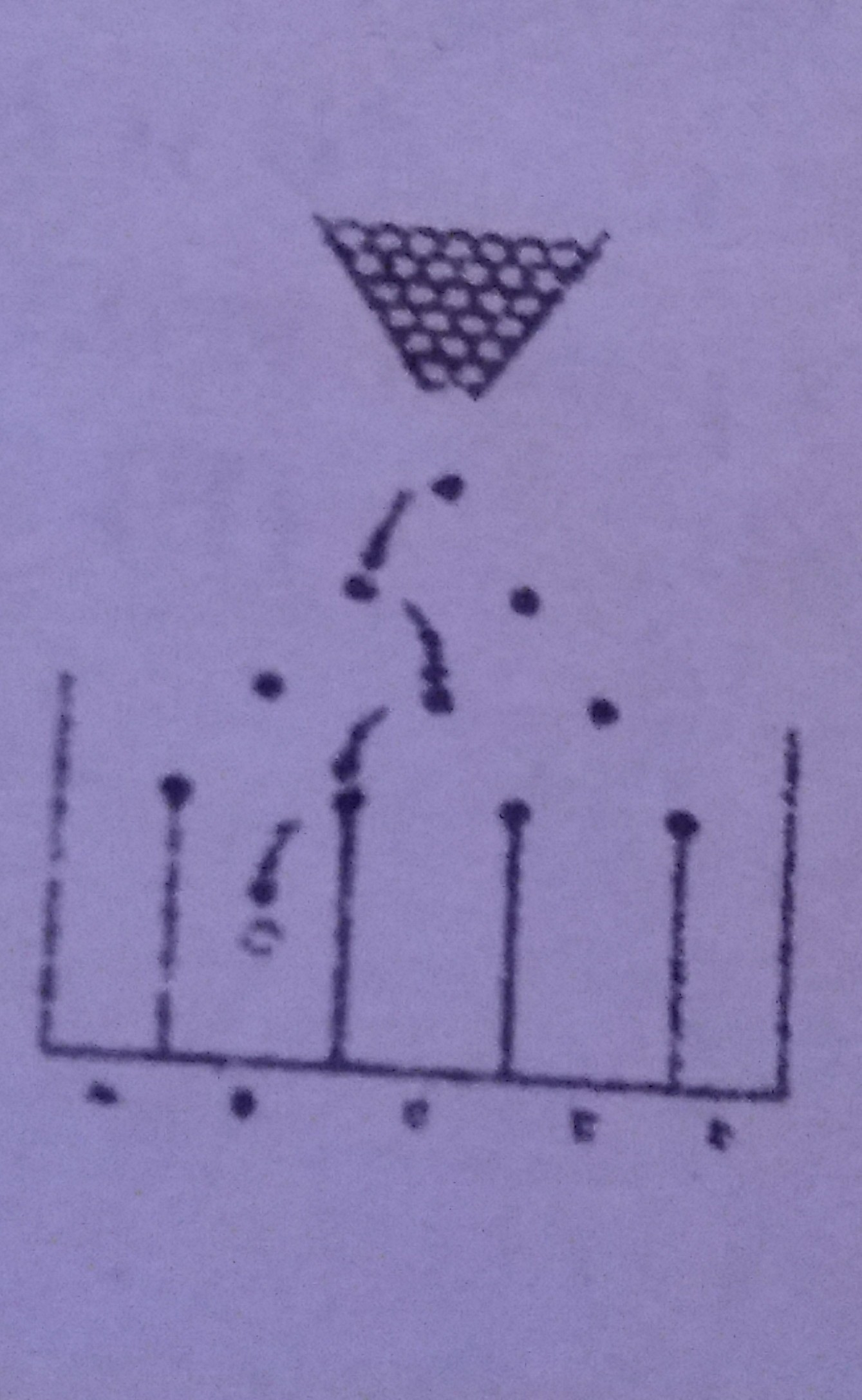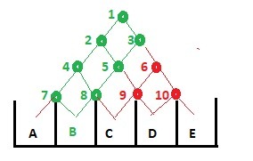 шары падают из Воронки и летят вниз вдоль доски в которые вставлены ряды штырков в нижней части доски расположенное в отсеке ABCDE в которой подают мячи Каждый раз когда шар натыкается на штырек он отклоняется вправо или влево один из возможных путей шара показана на рисунке Сколько разных пути могут привести падающий шар в отрезке В ?