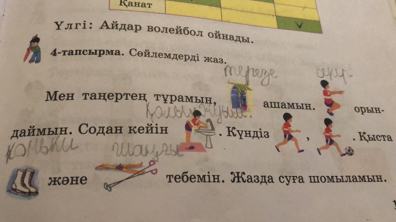 Мен таңертең тұрамын.Терезе ашамын.Жаттығу орындаймын.Содан кейін қолымды жуамын.Күндіз жүгіремін,футбол ойнаймын.Қыста коньки және шаңғы тебемін.Жазда суға шомыламын