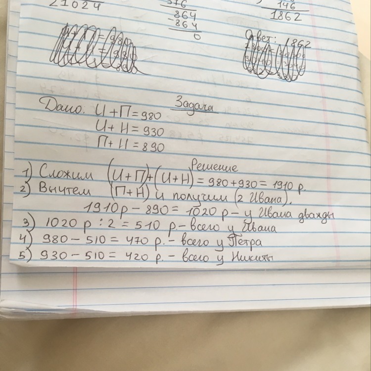 Затем, вычитаем из суммы деньги (Пётра и Никиты) и у нас остаются дважды деньги Ивана