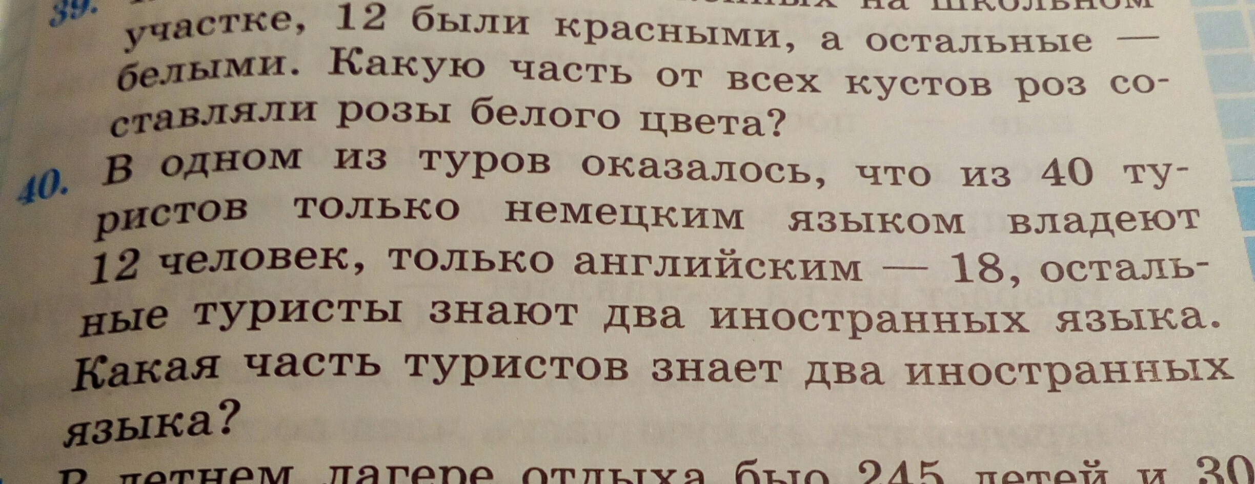 3) 10 : 40 = 1/4 (тур.) - знают оба языка