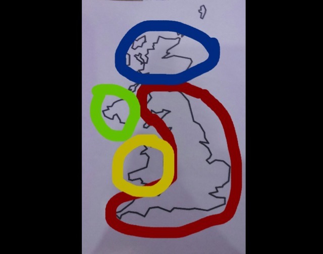 Там не штаты. Есть 2 острова Великобритания и Ирландия. Само государство Соединенное королевство (The United Kingdom) состоит из Англии (England)(Красный цвет), Шотландии (Scotland) (Синий цвет), Уэльса (Wales) (Желтый цвет) и Северной Ирландии (The Northern Ireland) (Зеленый цвет). Полностью государство называется Соединенное королевство Великобритании и Северной Ирландии (The United Kingdom on Great Britain and Northern Ireland) НЕ БЛАГОДАРИТЕ)