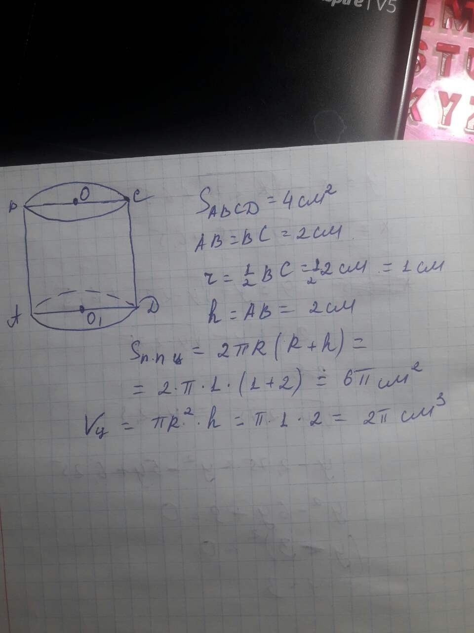 соответственно высота цилиндра тоже равен 2 см. А радиус основания половине диаметра или 1 см. Дальше по формулам