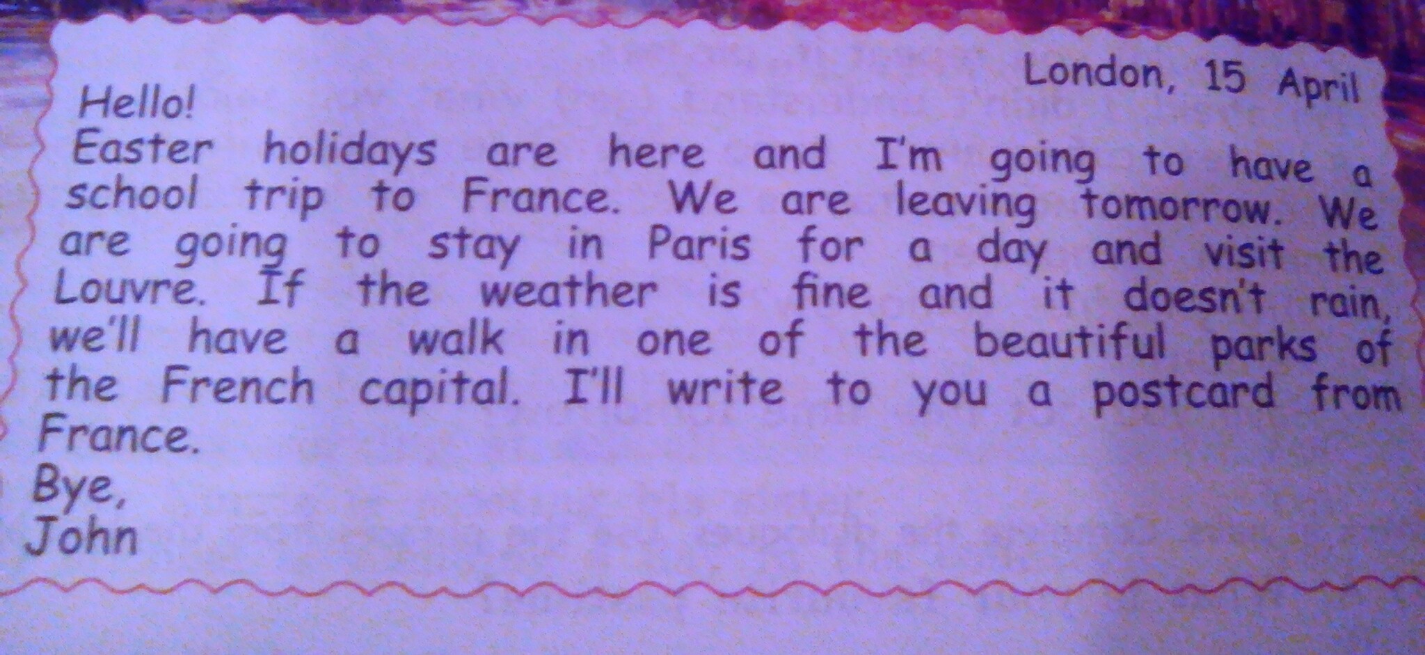 Пришли пасхальные каникулы и я собираюсь поехать в школьное путешествие во Францию. Мы выезжаем завтра. Мы собираемся остаться в Париже на день и посетить Лувр. Если погода будет хорошая и не будет дождя то мы прогуляемся в одном из красивых парков столицы Франции. Я пришлю тебе открытку из Франции.
