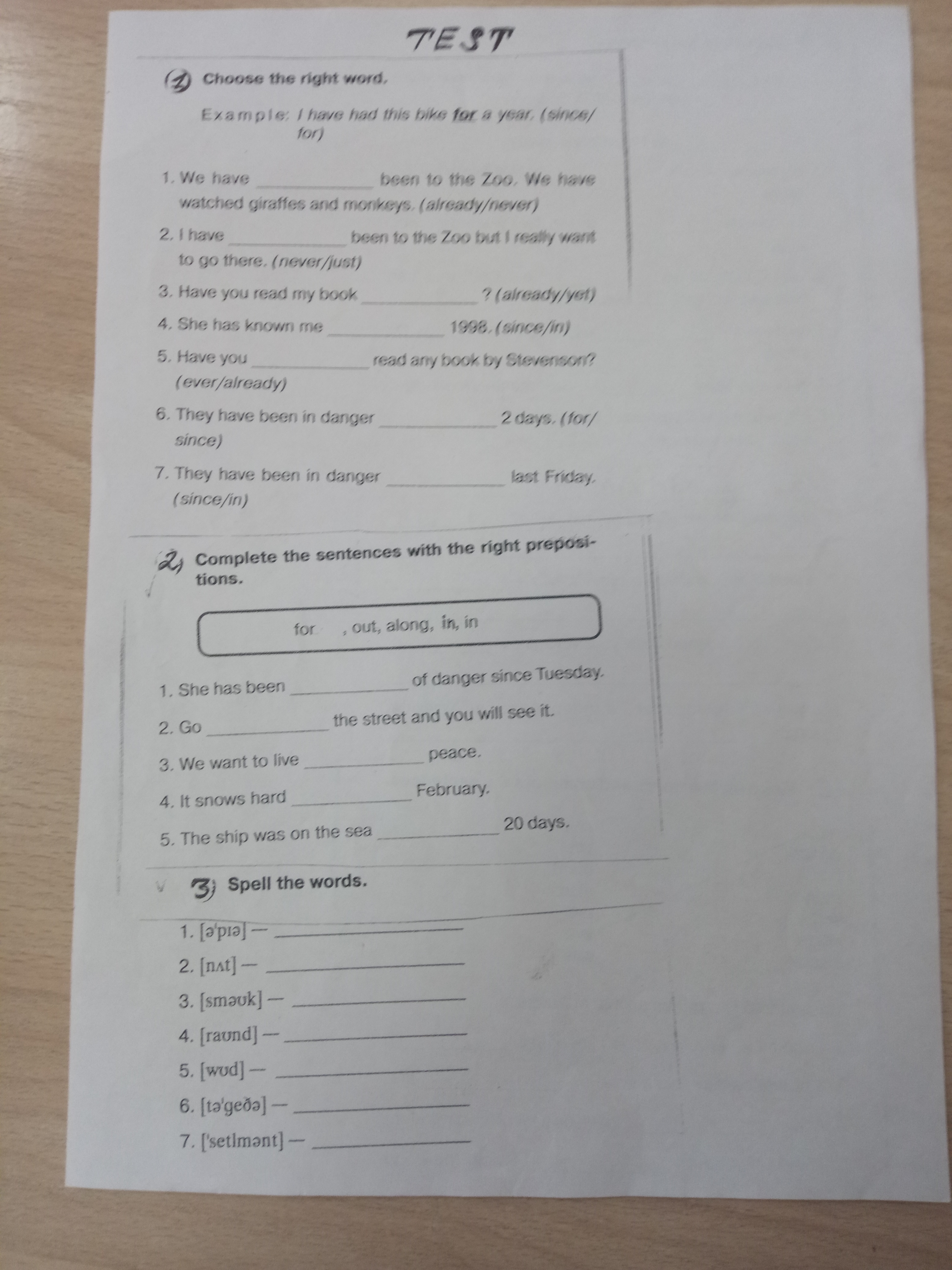 1. Already, never, yet, since, ever, for, since. 2. Out, in, in, along, for. 3. Appear, nut, smoke, round, wood, together, settlement.