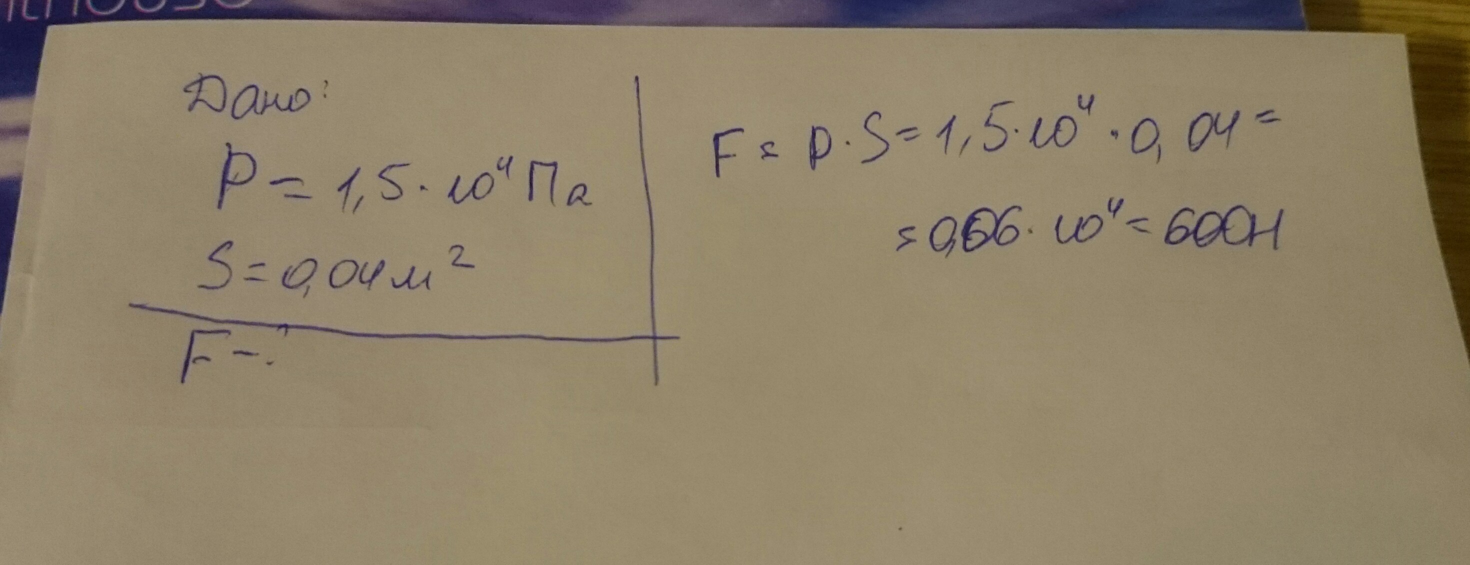 Человек оказывает на пол давление 1.5*10^4 Па. Площадь подошв на которую он опирается,равна 0.04м^2 определите силу с которой он давит на пол?