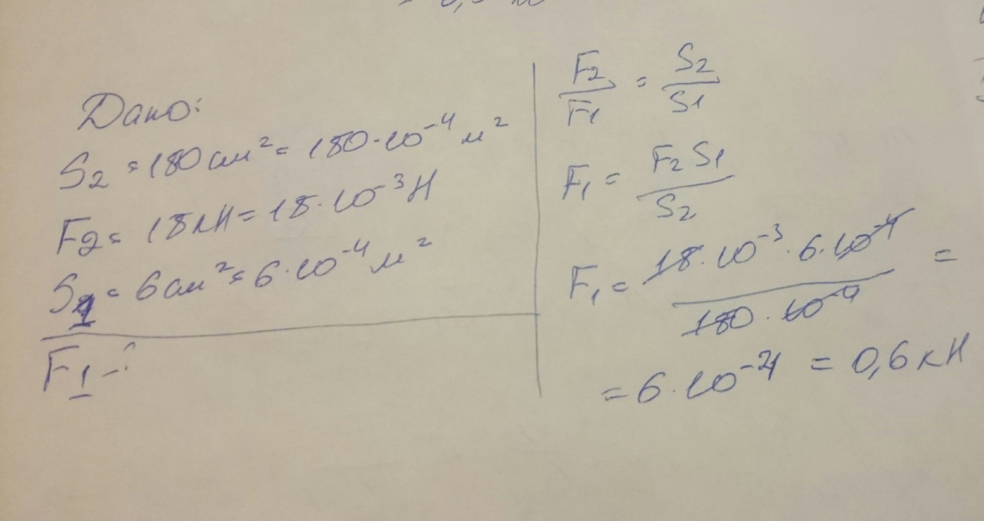 На большой поршень гидравлического пресса площадью 180 см2 действует сила 18 кН. Какая сила действует на маленький поршень, площадь какого 6 см2