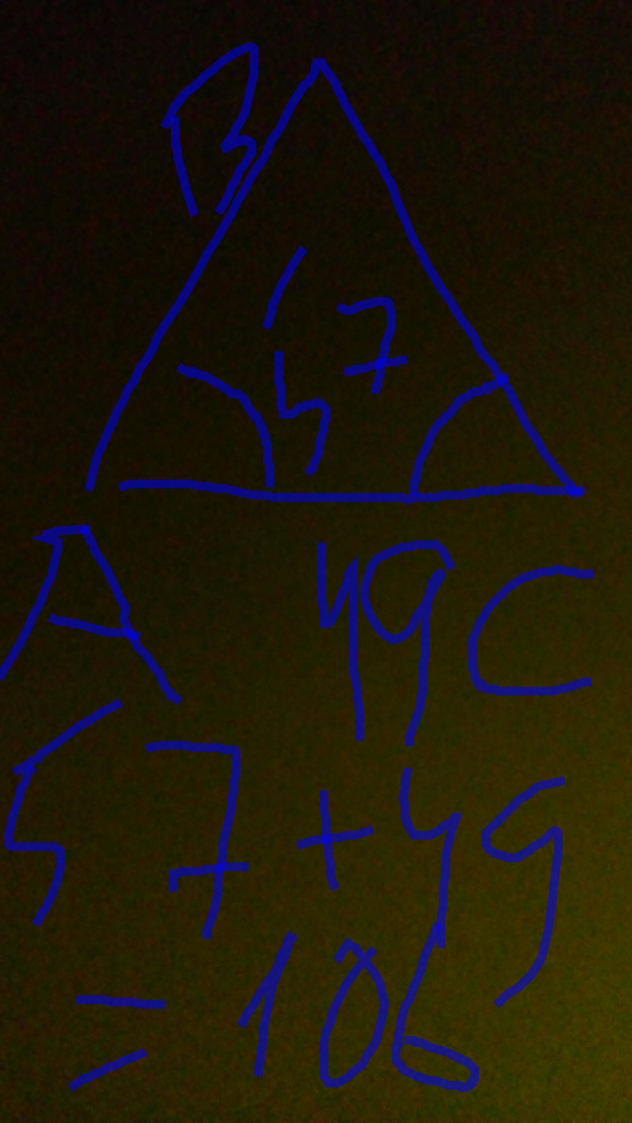 При вершине A равен 57 градусам, а внутренний при вершине C равен 49 градусам. Найдите внешний угол при вершине B. Спасибо заранее, можете пожалуйста написать условие и чертёж если написать решение будет тяжело, тогда не пишите.