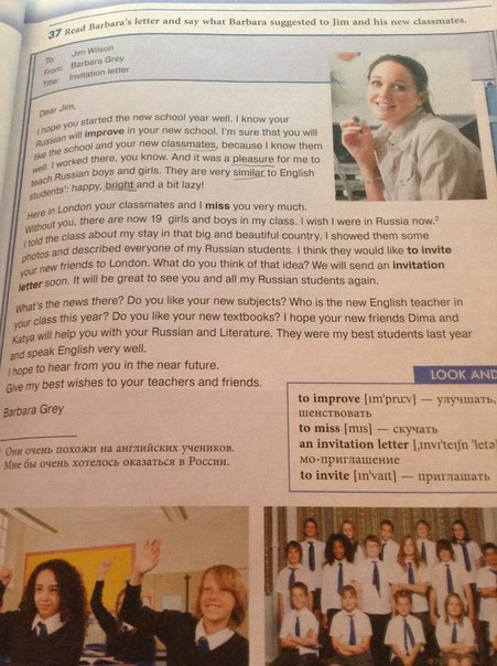 здесь в лондоне твои одноклассники и я очень скучаем по тебе. без тебя у меня в классе 19 мальчиков и девочек. я хотела бы быть сейчас в россии. я рассказала классу о моем проживании в этой большой и красивой стране. я показала им несколько фотографий и описала каждого моего русского ученика. я думаю они бы с удовольчствием пригласили бы твоих новых друзей в лондон. что ты думаешь насчет этой идеи? мы скоро пошлем пригласительное письмо. было бы замечательно увидеть тебя и моих русских учеников снова.