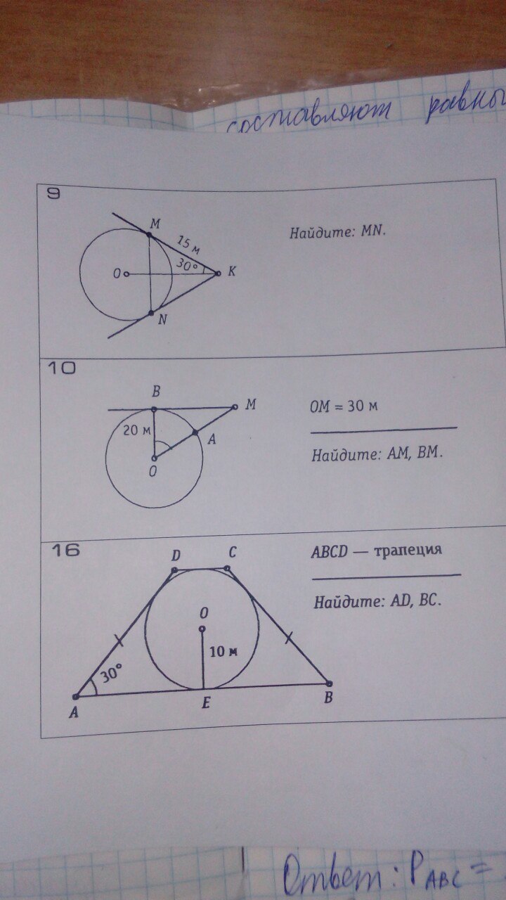 Ну так чего сложного из точки д опускаешь высоту, получается прямоугольный треугольник, радиус окружности дан, вычисляешь диаметр он равен 20м, и по формуле считаешь нужную тебе гипотенузу, AD = 20/(разделить) на косинус 30градусов он равен о,5 или одной второй 20/0'5 = 10