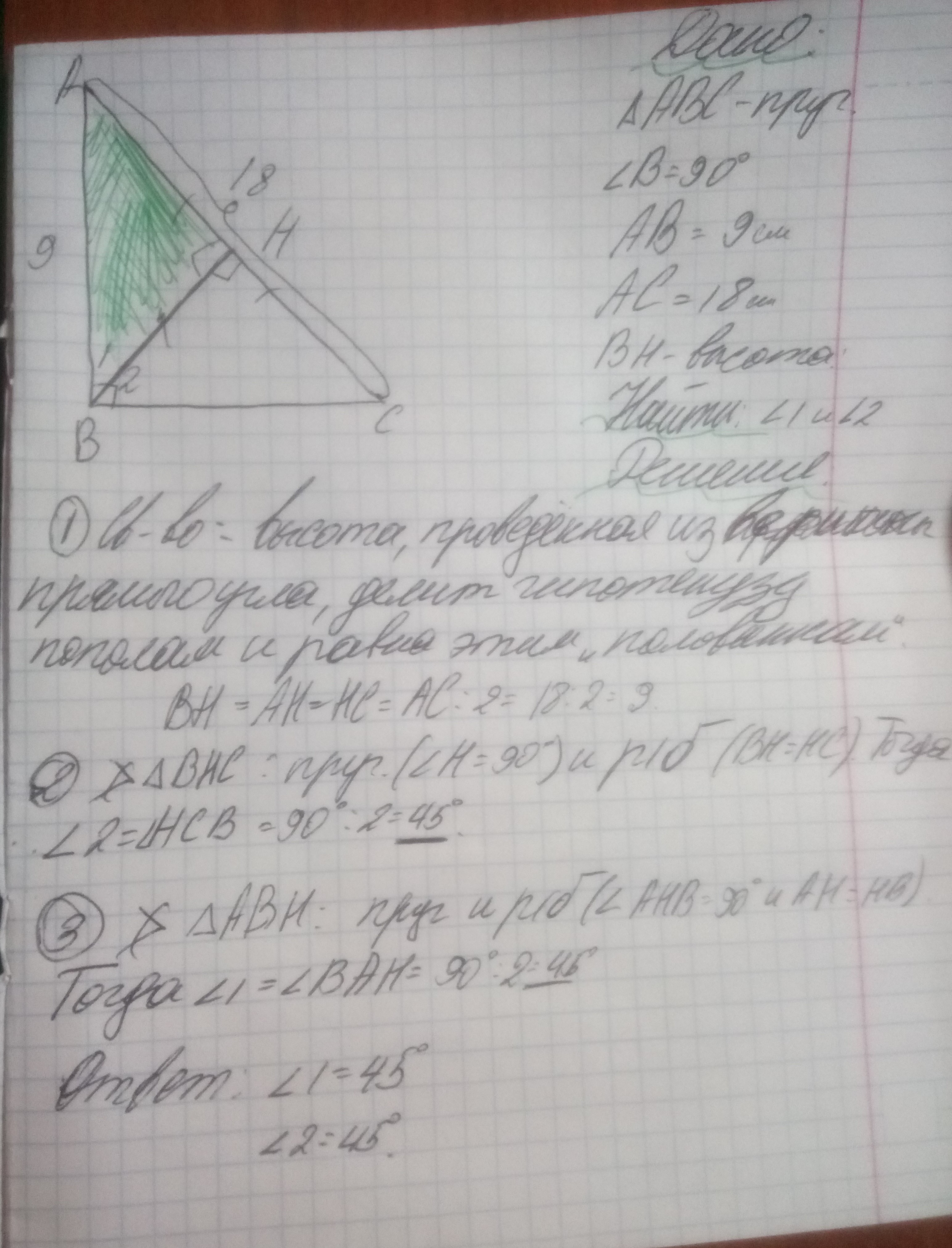 Спроси про свойство у учителя. Оно тебе понадобится. Надеюсь, что я правильно решила. Просто там смотри, получается что зелёный треугольник равеосторонний, а не рб (хотя это тоже) и тогда, угол 1=60гр (свой был равгомторонеего треуг). Может в условии ошибся? Просто я такие задачи решала и там правильно получается по 45. И в этой задаче тоже правильно 45,тк по теореме Пифагора ВС не равно 9. А угол 1+угол2=90гр. И правильно 45. Крч спроси у учителя.