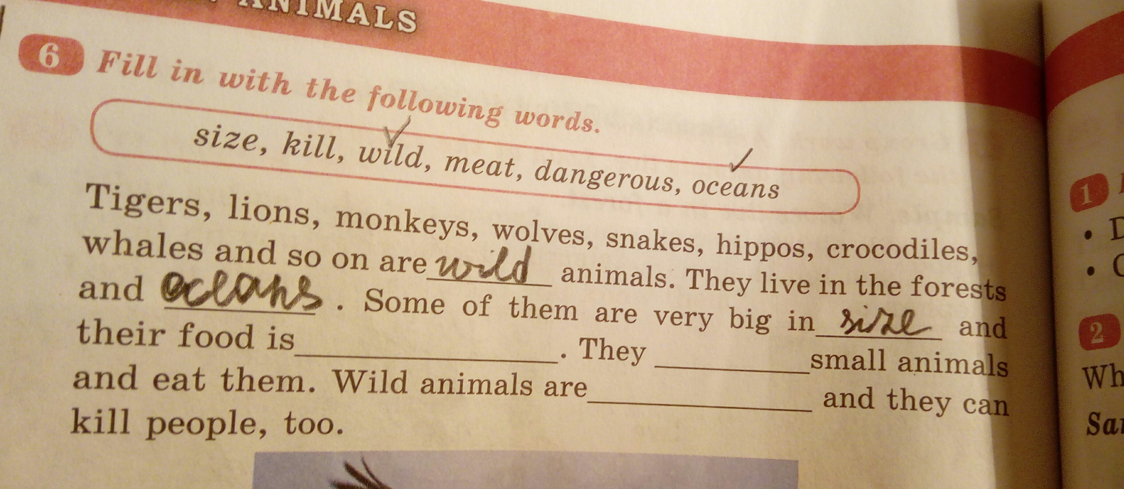 Tigers, lions, monkeys, wolves, snakes, crocodiles, whales nd so on are wild animals. They live in forests and oceans. Some of them are vvery big in size and their food is meat. They kill small animals and eat them. Wild animals are dangerous and they can kill people, too.