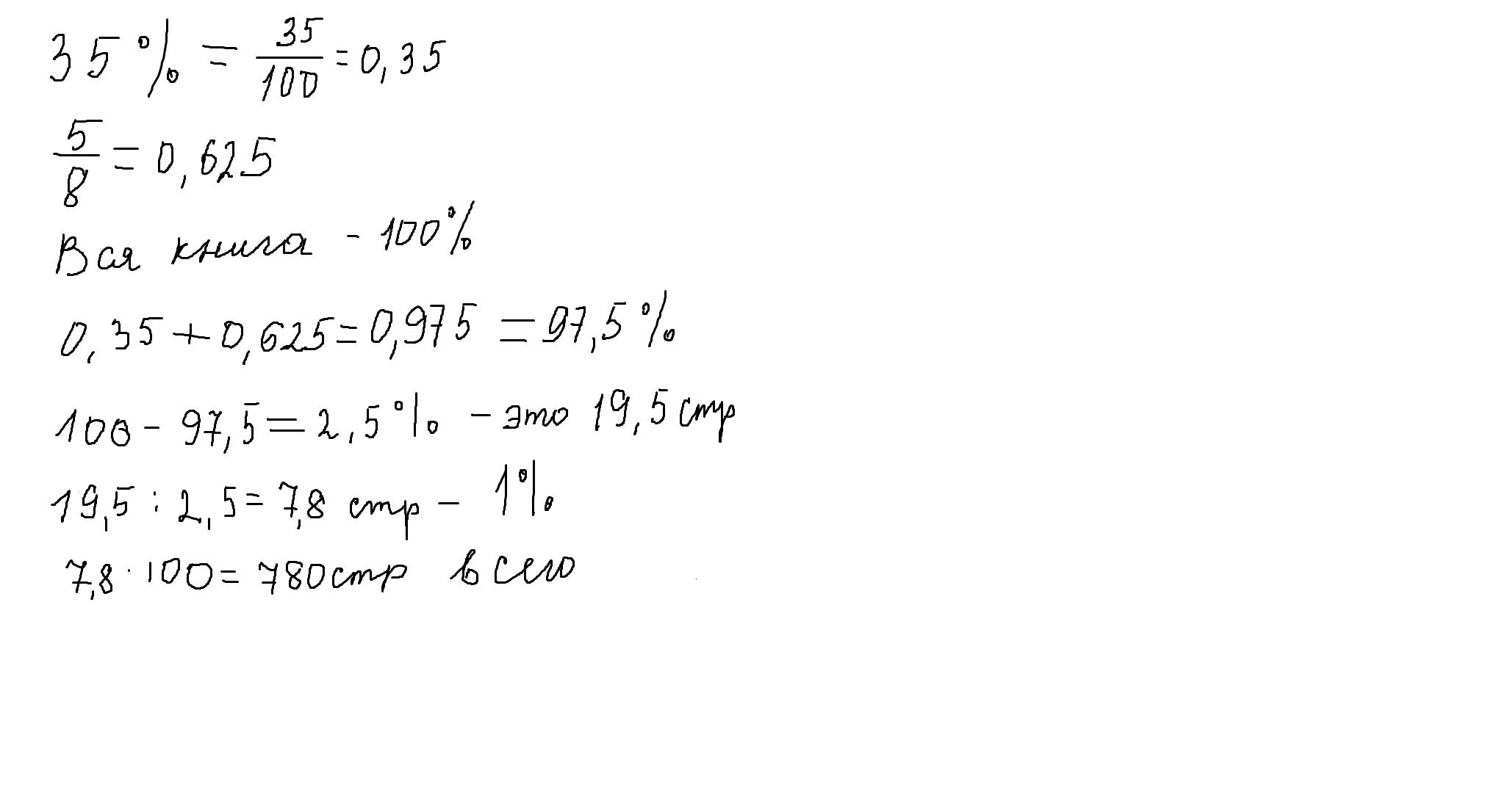 прочитал 35% всей книги, а во второй день пять восьмых (обыкновенная дробь), а в третий день он прочитал 19,5 страниц. Сколько страниц в книге всего? Срочного!!!!! Помогите пожалуйста!!!