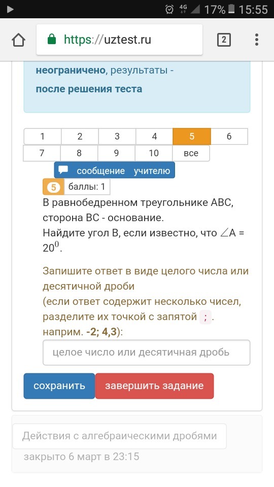 тк сумма углов треугольника равна 180 градусам=> угол В=углу C= (180-уголА):2= (180-20):2=160:2=80градусов