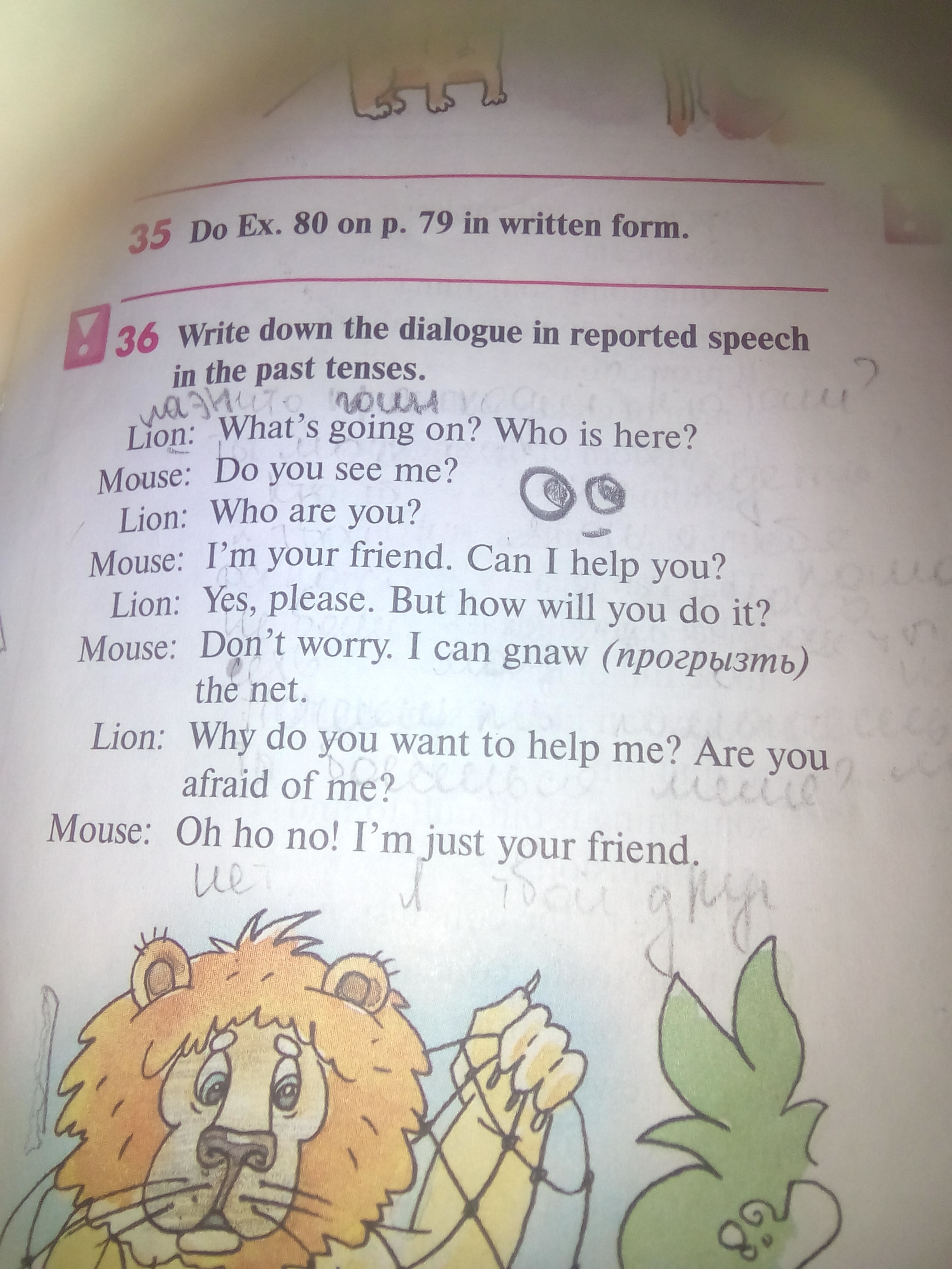 The Lion asked what was going on and who was there. The Mouse wondered if he could see her. The Lion asked who she was. The Mouse answered that she was his friend. She also asked if she could help him. The Lion answered that he needed help. But he didn’t know how she would help him. The Mouse asked the Lion not to worry. The Mouse said that she would gnaw the net. The Lion asked why she wanted to help him. He wondered if the Mouse was afraid of him. The Mouse answered that she wasn’t. She said that she was his friend.