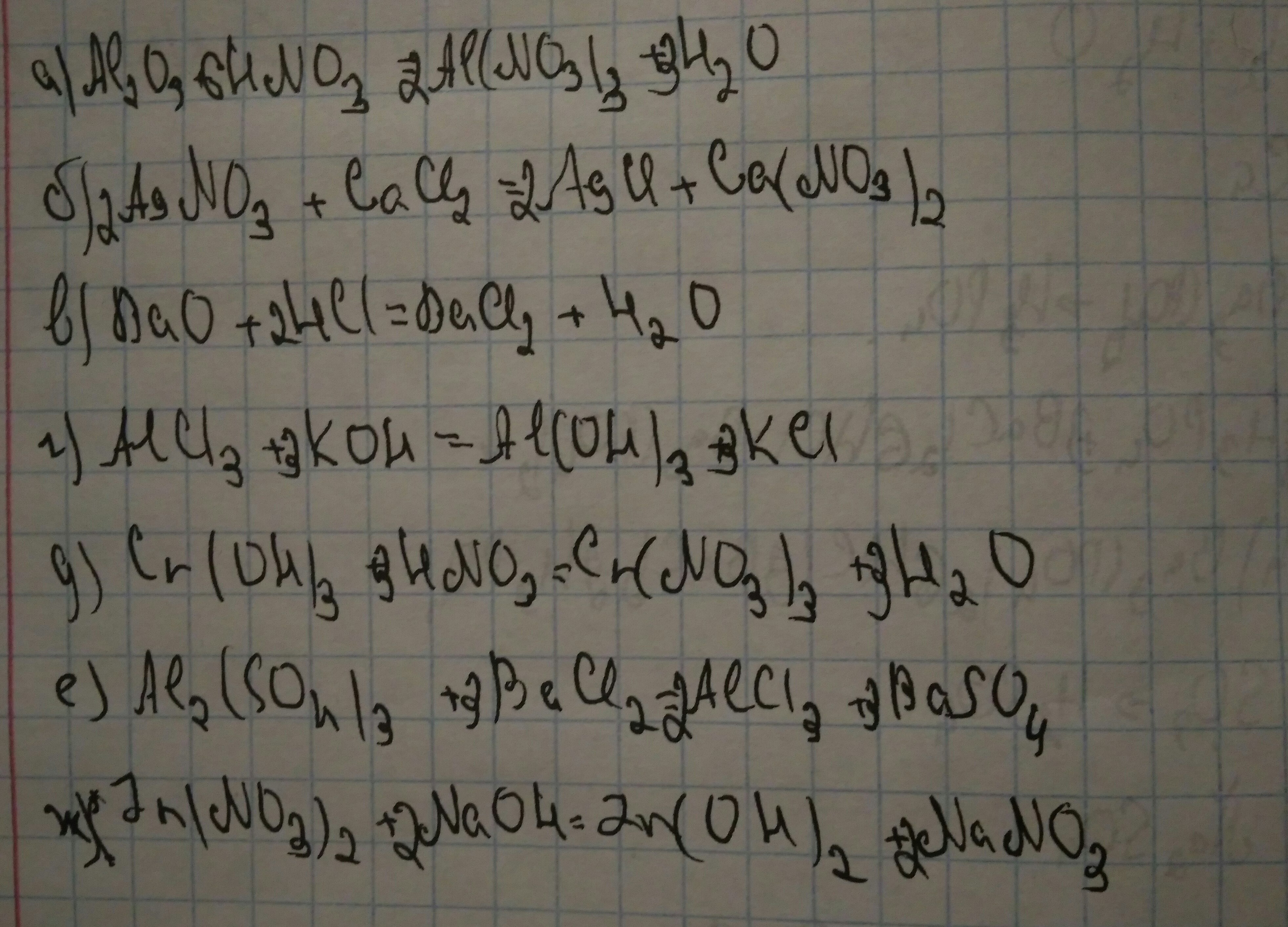 Написать уравнения:а) оксид алюминия+азотная кислота; б)нитрат серебра+хлорид кальция; в)оксид бария+соляная кислота; г)хлорид алюминия+гидроксид калия; д) гидроксид хрома (III)+азотная кислота; е)сульфат алюминия+хлорид бария; ж)нитрат цинка+гидроксид натрия