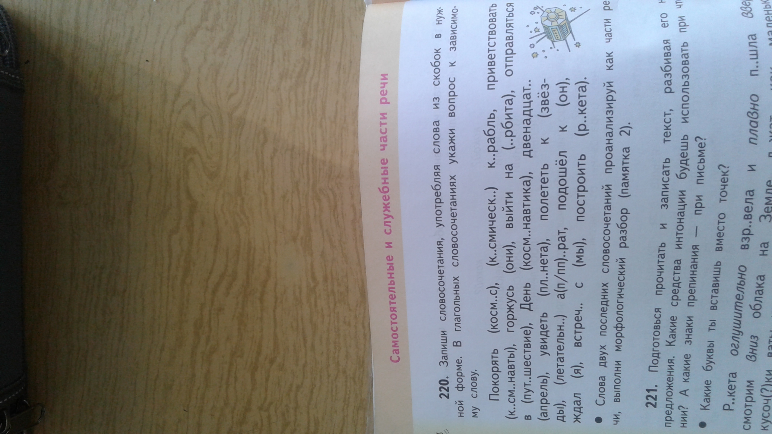 Покорять(что?)космос,космический корабль,приветствовать(кого?) космонавтов,горжусь(кем?) ими,выйти(куда?) на орбиту,отправляться(куда)в путешествие,день Комонавтика,двенадцатое апреля,увидеть(что?) планету,полететь(к чему?) к звёздам,летательный аппарат,подошёл(к кому?) к нему,ждал(кто?) я,встречу(с кем?)с нами,построить(что?)ракету.