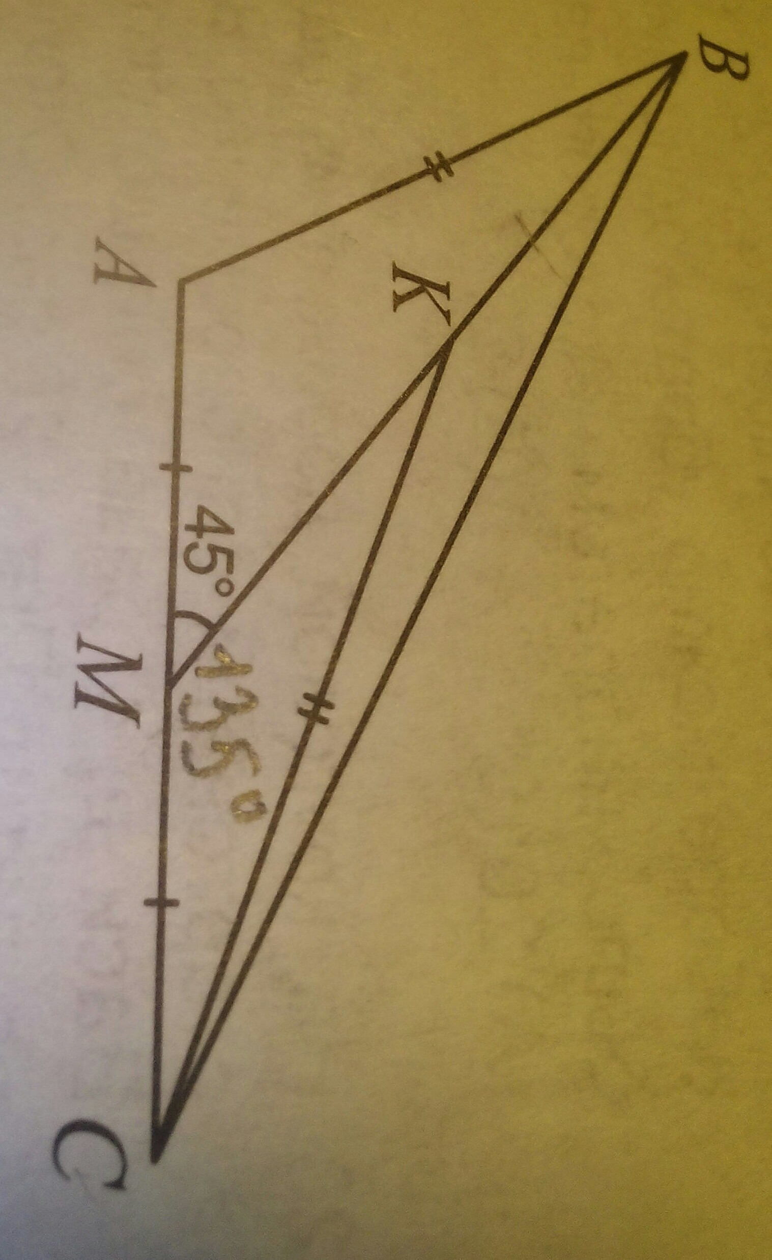 В треугольнике ABC проведена медиана BM. Известно, что угол AMB=45°. На отрезке BM выбрана точка K такая, что AB=KC. Оказалось, что BK=1 см. Найдите AC.