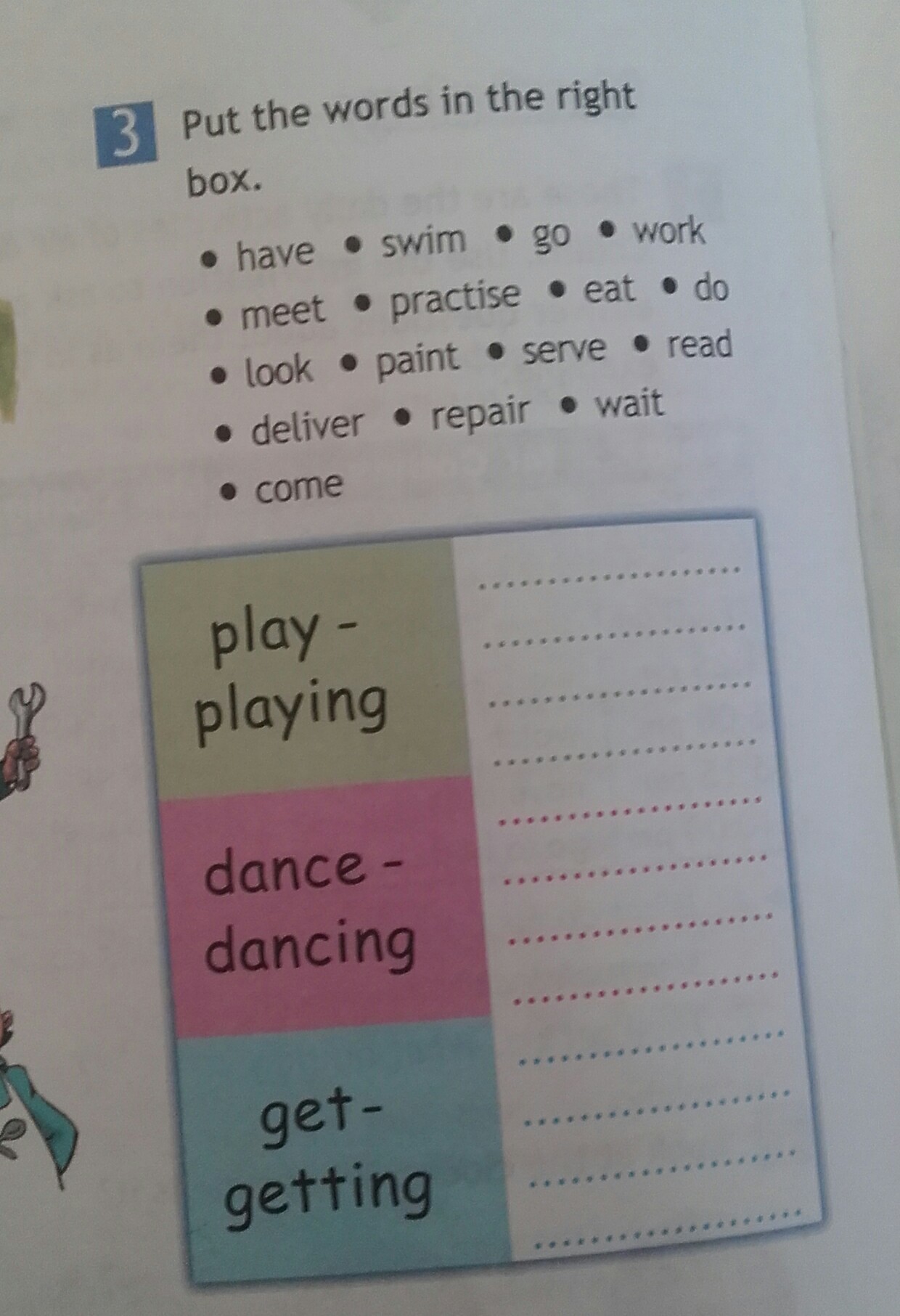 Зелёная колонка: go-going, work-working, meet-meeting, eat-eating, do-doing, look-looking, paint-painting, read-reading, deliver-delivering, repair-repairing, wait-waiting.
