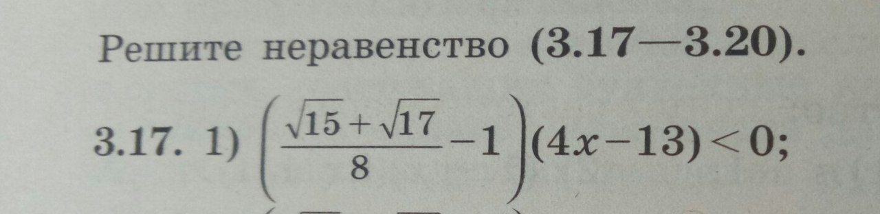 √15 + √17 < 8, то есть √15 + √17 - 8 < 0, значит, скобка всегда отрицательно, а следовательно, выражение будет меньше нуля только тогда, когда вторая будет положительна, то есть когда 4x-13>0