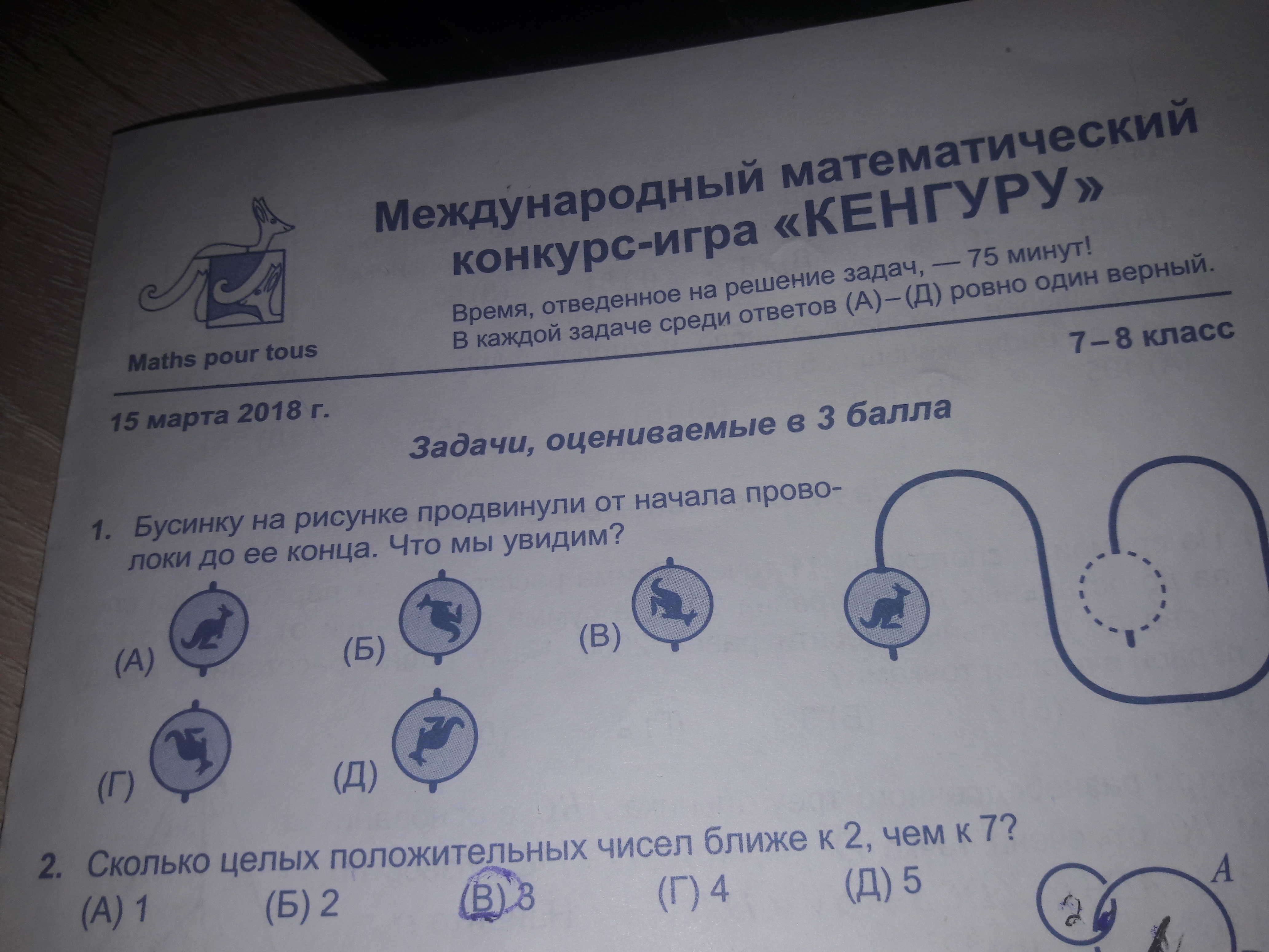 Логично, что бусинка не поворачивается относительно проволоки, те кенгуру всегда смотрит "вверх". На первом повороте кенгуру "встанет" в позицию в позицию в, на нижнем участке-тоже в позицию в. При подъеме вверх бусинка будет повернута,как в варианте а, и затем поменяет свое направление (рисунок перевернется) и бусинка станет в позиции Д.
