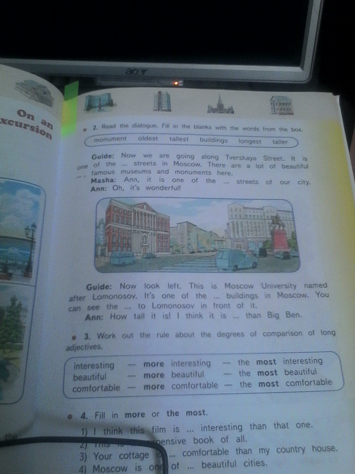 Сейчас мы идем вдоль (по) улицы (улице) Тверская. Это одна из самых длинных улиц в Москве. Там есть много прекрасных зданий, известных музеев и памятников.