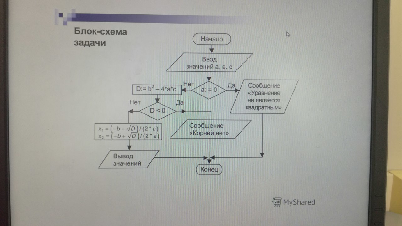 begin writeln('a b c'); raedln(a); readln(b); readln(c); D:=(sqr(b))-4*a*c; if D>=0 then begin x1:=(-b+sqrt(D))/(2*a); x2:=(-b-sqrt(D))/(2*a); writeln('x1=',x1,'x2',x2) end; end.