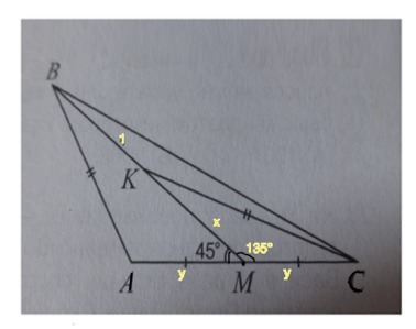 В треугольнике АВС проведена медиана ВМ. Известно,что угол АМВ=45°. На отрезке ВМ выбрана точка К такая,что АВ = КС. Оказалось,что ВК = 1. Найдите АС