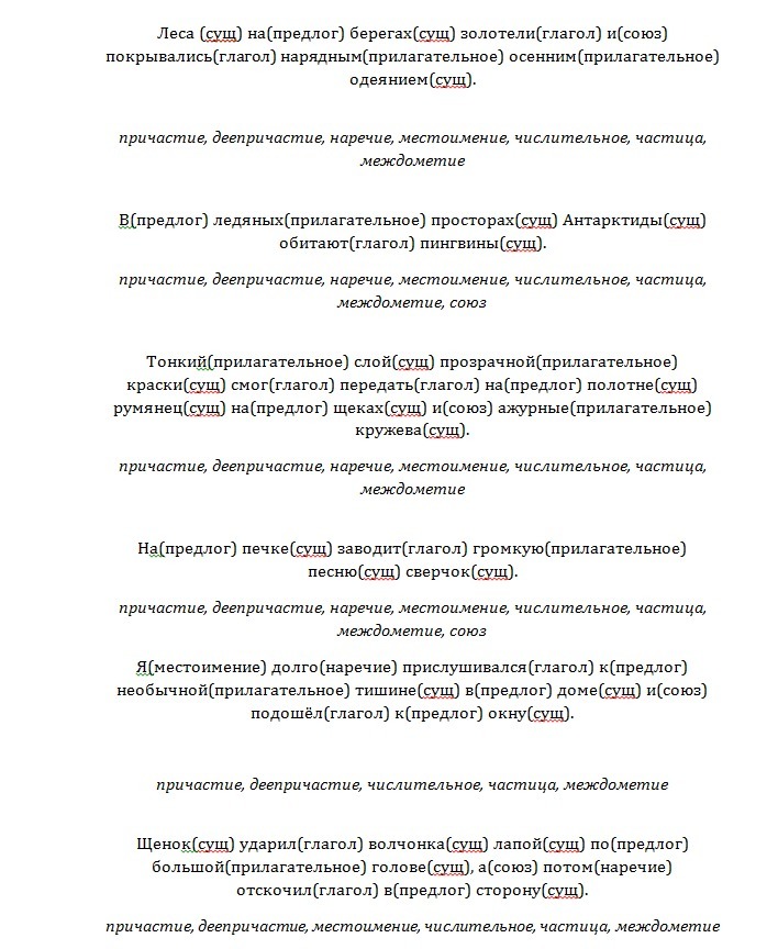 Над каждым словом напишите, какой частью речи оно является. Запишите, какие из известных вам частей речи в предложении отсутствует.