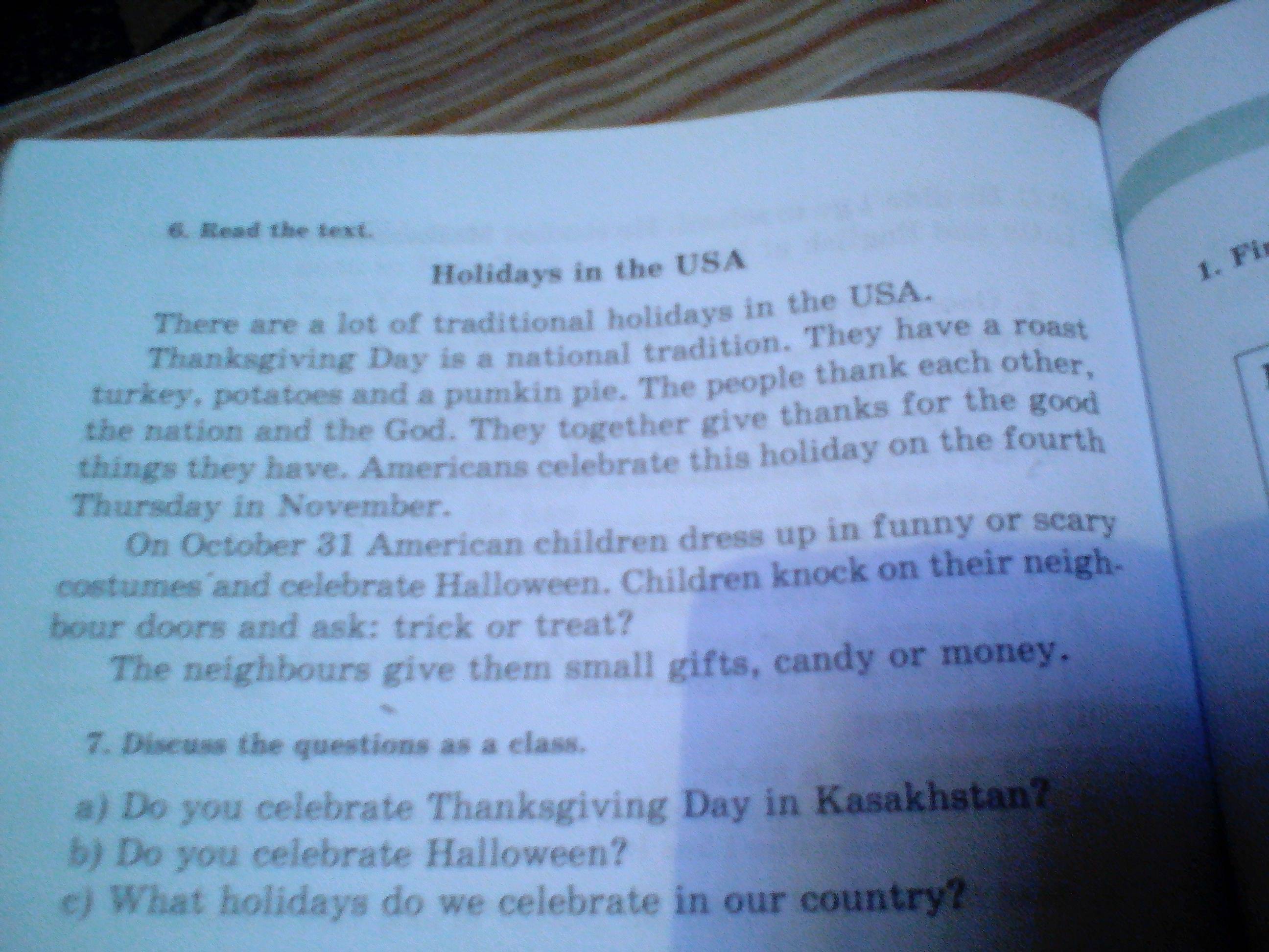 Відпочинок в США Є багато традиційних свят в США. смажена подяка традиції. У них День - це національна індичка і пиріг, народ подякує одне одному нації та Бога. Вони разом дякують за те, що вони мають. Американа святкує це свято четвертого четверга в листопаді. 31 жовтня американські діти одягаються у забавні костюми та святкують Хеллоуїна, діти стукають у двері своїх сусідів та запитують: трік чи лікують? Сусіди дають їм маленькі подарунки, цукерки або гроші.