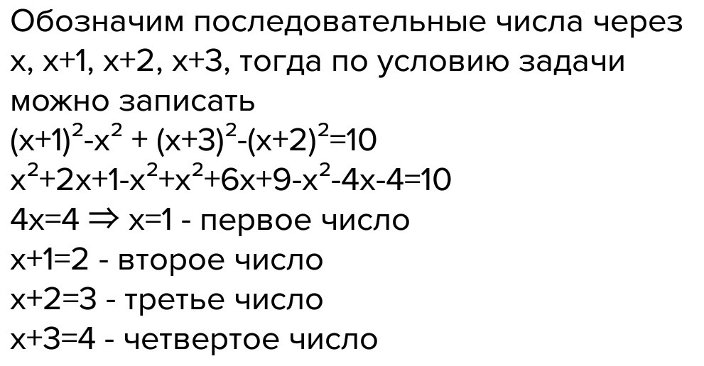 Сумма разности квадратов двух последовательных натуральных чисел и разности квадратов следующих двух последовательных натуральных чисел равна 22. Найдите эти числа. если разности квадратов неотрицательны.