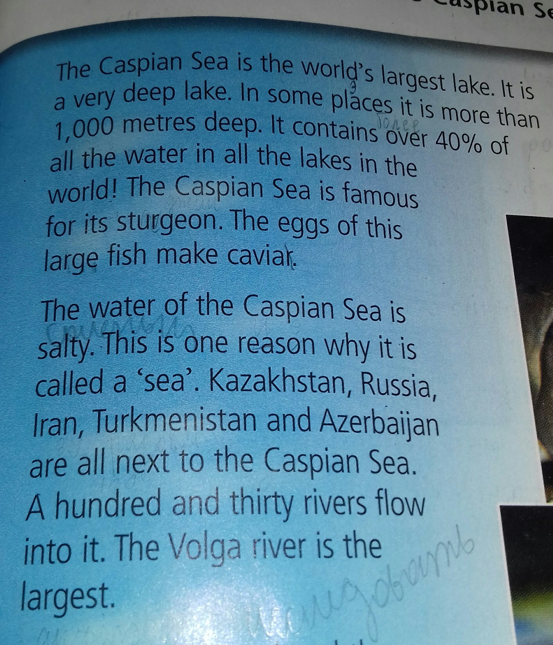 Тан Каспийское море - самое большое в мире озеро Это глубокое озеро. В некоторых местах он глубже метров. содержит более 40% 1000 воды во всех озерах Каспийского моря, славящегося своим осетровым. Яйца этой крупной рыбы делают икру. Вода Каспийского моря соленая. Это одна из причин, почему это называется «море». Казахстан, Россия, Иран, Туркменистан и Азербайджан находятся рядом с Каспийским морем. В нее втекает сто тридцать рек. Река Волга самая большая.