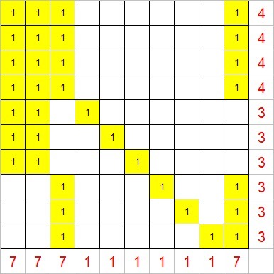 даст решение (4; 6). Значит, в 4 столбцах будет закрашено 7 клеток, а в 6 столбцах - одна. Дополнительно введенные 4 клетки равномерно распределим между этими строками, пользуясь условием, что в строке может быть 4 закрашенных клетки.