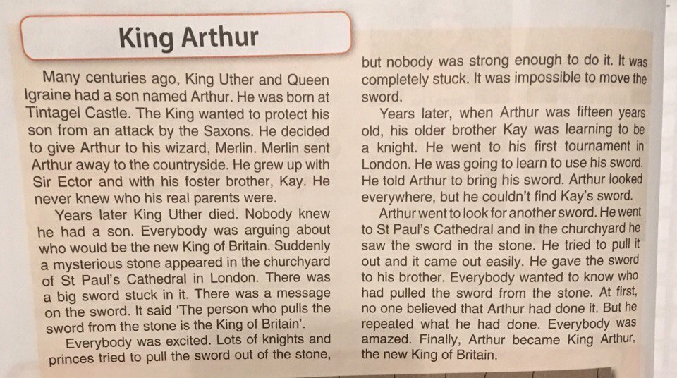 Годы спустя, когда Артуру было уже пятнадцать лет, его старший брат Кай обучался рыцарскому делу. Он отправился на своё первое соревнование в Лондон. Он собирался учиться правильно использовать свой меч. Он сказал Артуру принести его меч. Артур искал везде, но не мог найти меча Кая.