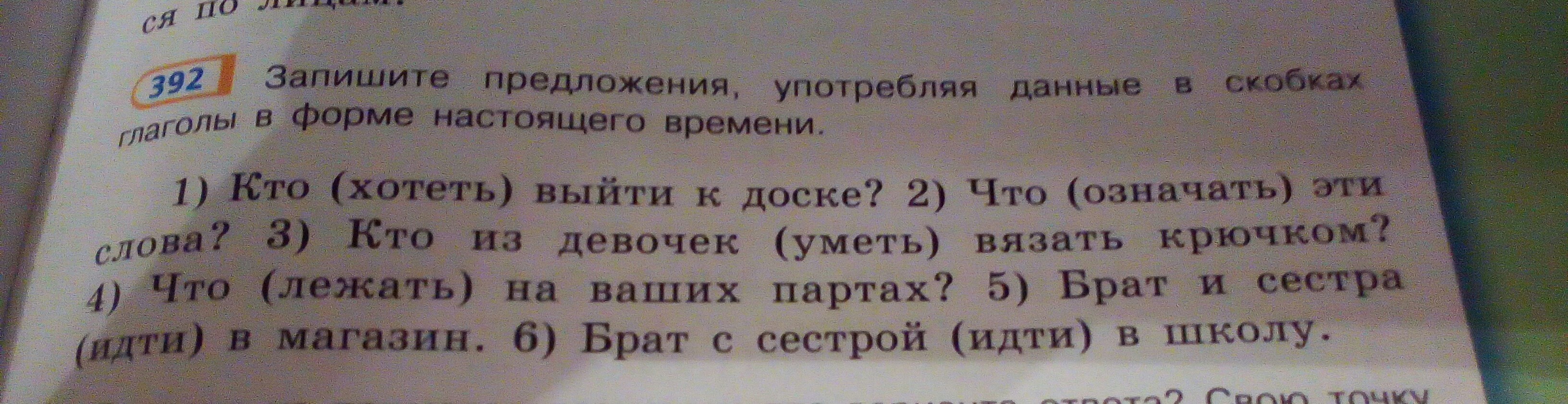 Кто хочет выйти к доске?Что означают эти слова?Кто из девочек умеет вязать крючком?Что лежит на ваших партах?Брат и сестра идут в магазин.Брат с сестрой идут в школу.