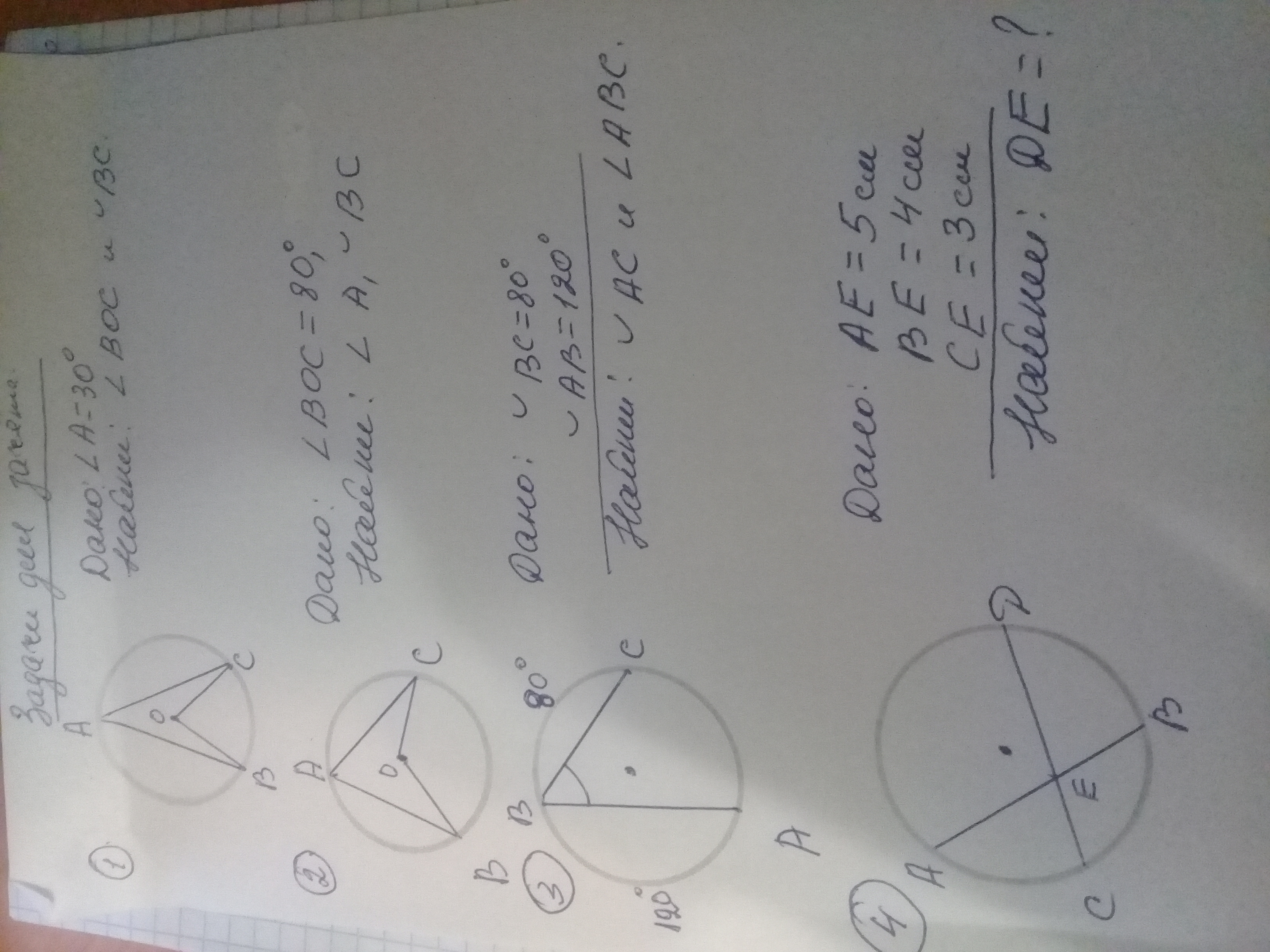 в 1 задаче ответ 15 градусов , во 2 угол а равен 40 градусов , и короче тма же 2 дуги бс большая и маленькая маленькая равна 40 градусов , большая 360 - 80 =280 градусов в 3 дуга ац равна 360 - (120+80) = 160 градусов угол абц равен 160 делим на 2 = 80 градусов