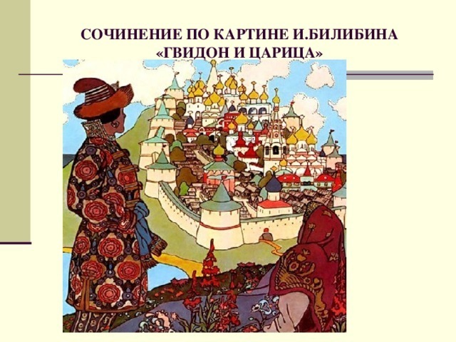 картина И.Билибина Гвидон и царица . кого вы видите на картине ? Опишите царевича Гвидона и царицу ( их одежда , позы .)?как художник изобразил город ?что изображено на переднем плане ?