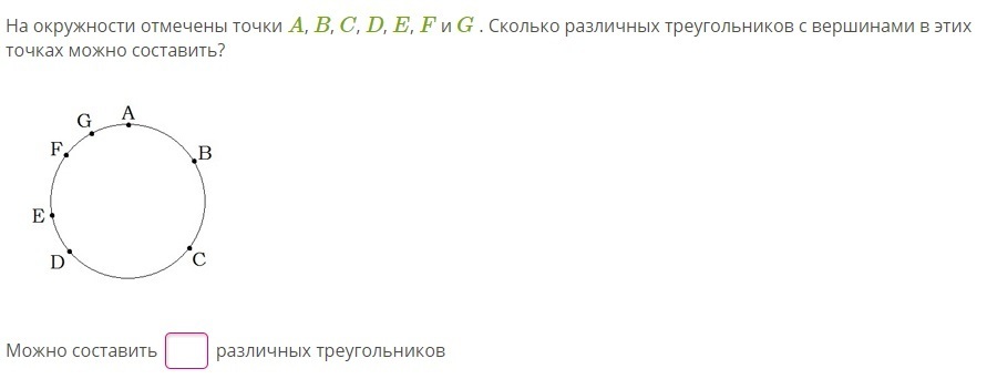 1) Будем выбирать число сочетаний из 7 по 3, так как нам не нужны повторения, то есть ABC и BCA это один и тот же треугольник, в принципе, то есть C из 7 по 3 = 7!/4!3! = 4! * 5 * 6 * 7 / 4! * 1 * 2 * 3 = 5 * 7 =35