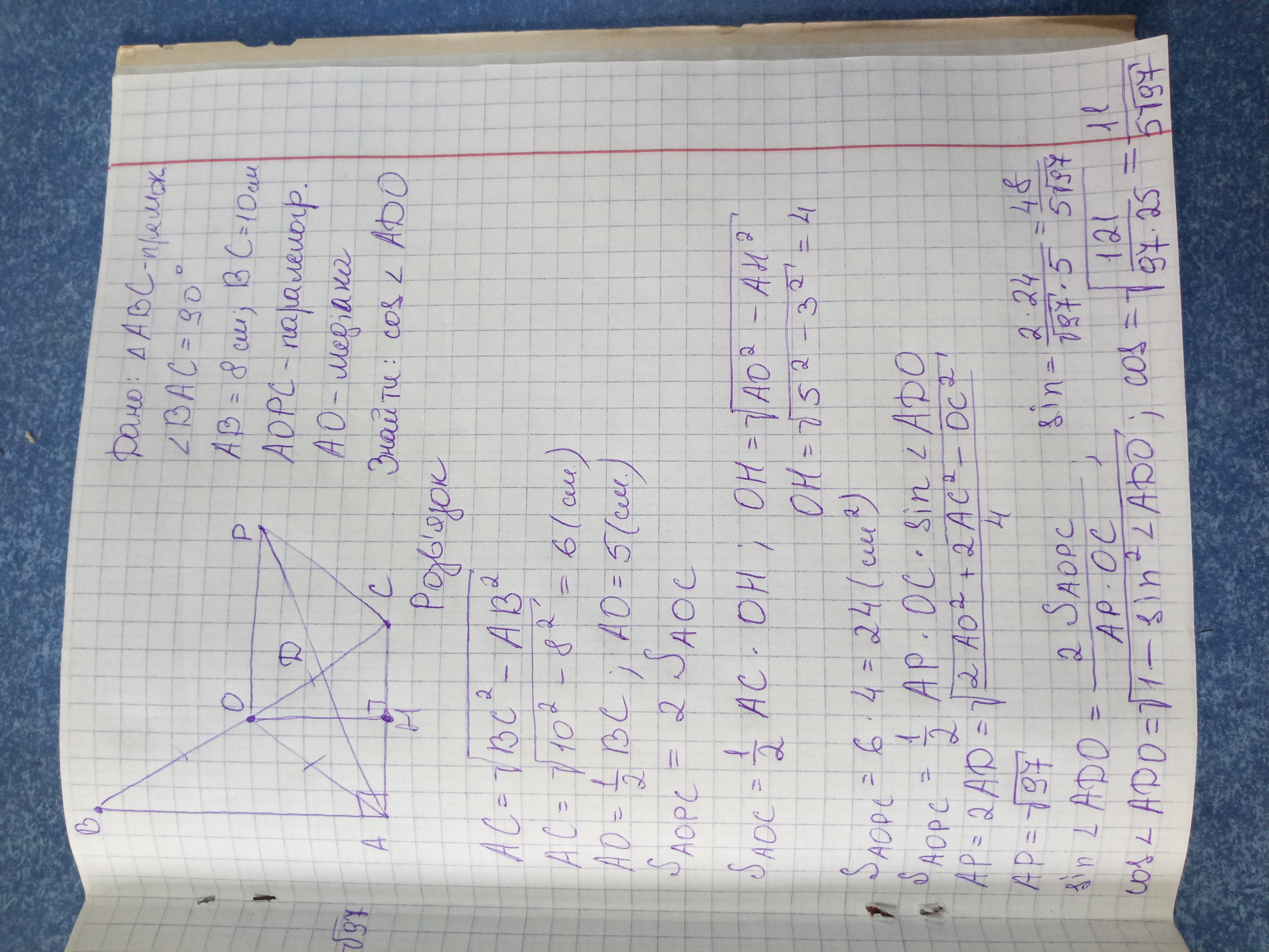 ДАЮ 100 баллов.Плис Отрезок АО - медиана прямоугольного треугольника АВС, у которого угол ВАС равен 90 градусов, АВ = 8 см, ВС = 10 см. На отрезках АО и АС как на сторонах построен параллелограмм АОРС. Вычислите косинус угла между прямыми, содержащими диагонали параллелограмма АОРС.Ответ должен быть 11/5√97