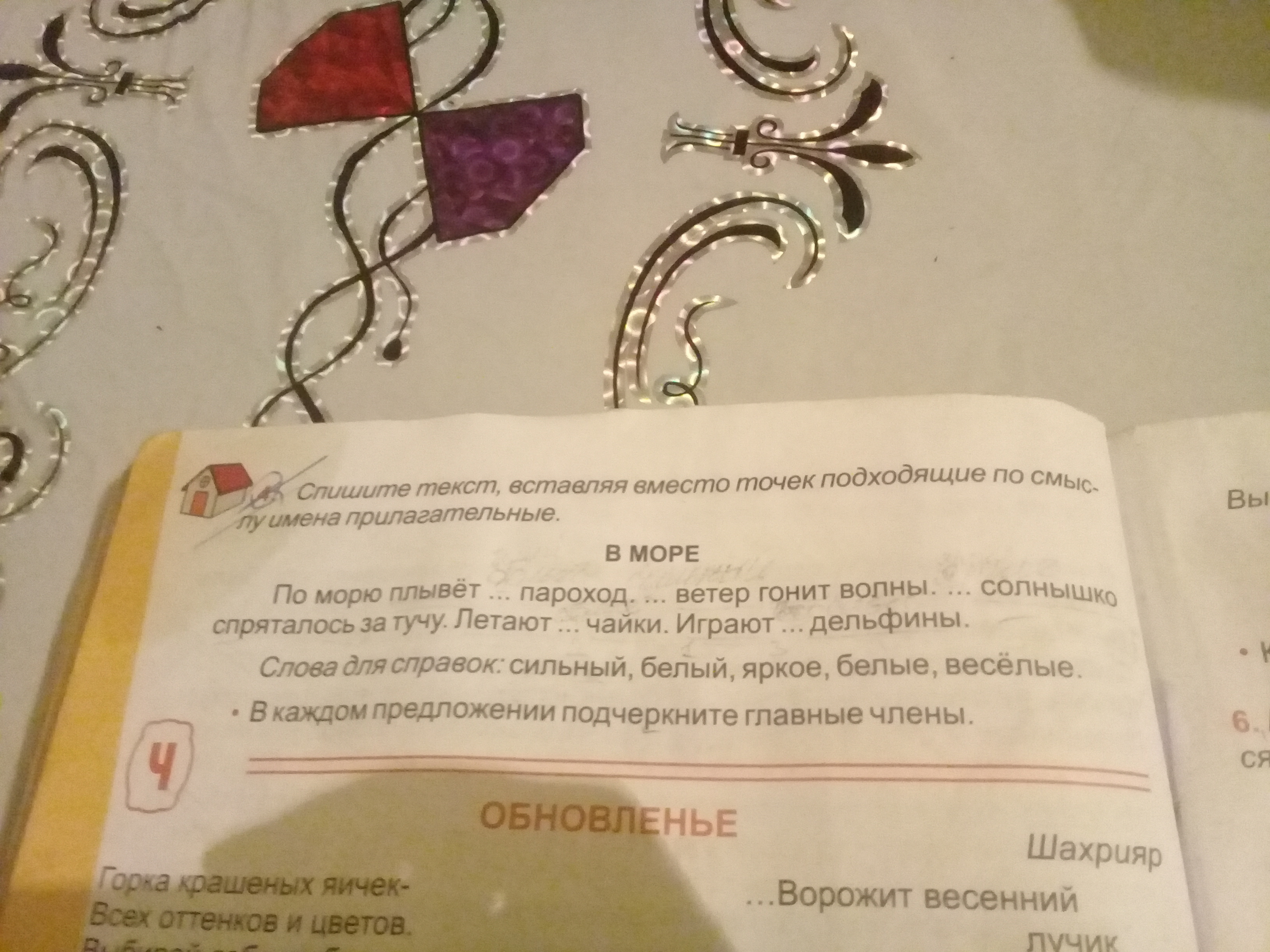 По морю плывет белый пароход. Сильный ветер гонит волны. Яркое солнышко спряталось за тучу. Летают белые чайки. Играют веселые дельфины.