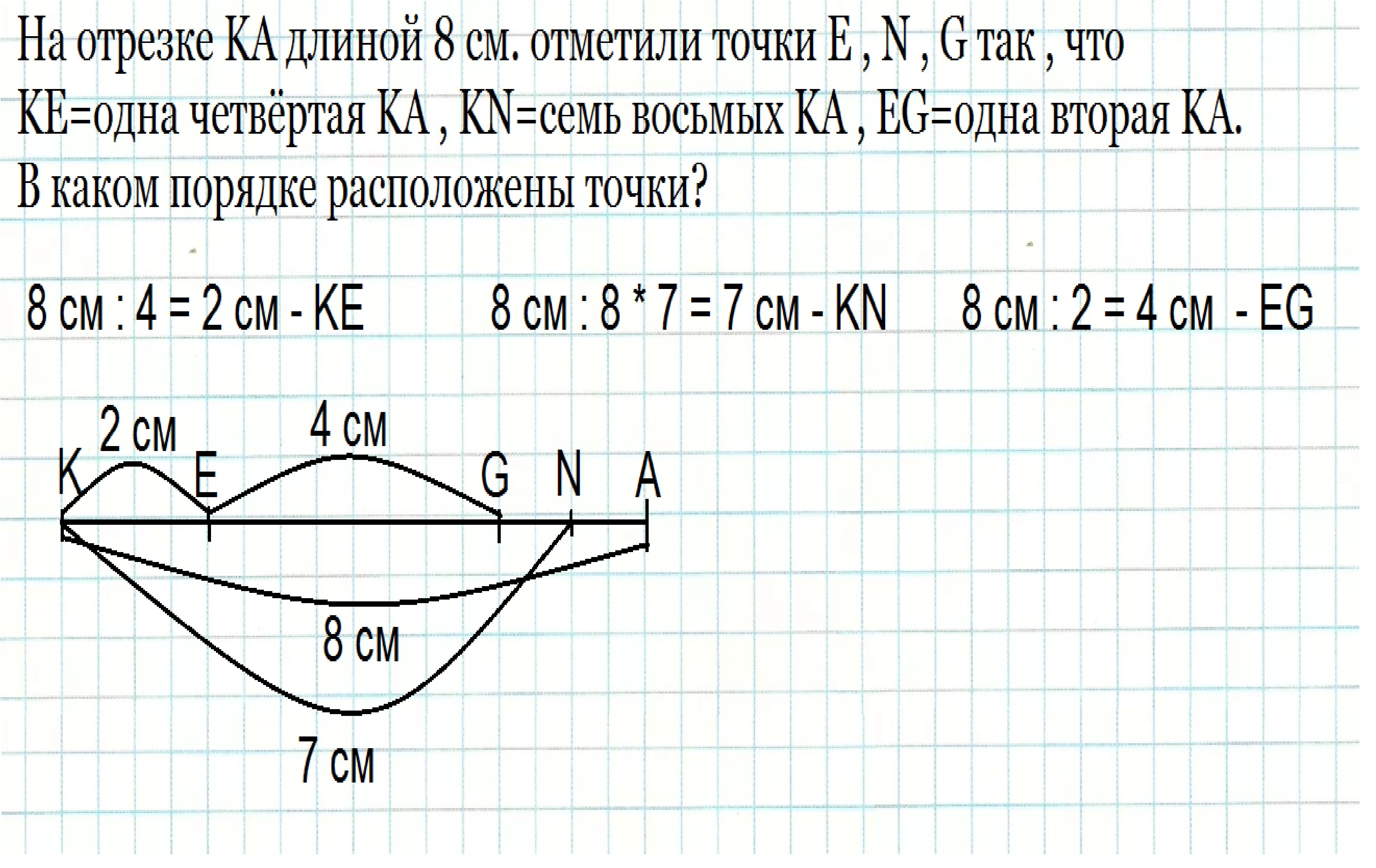 На отрезке KA длиной 8 см. отметили точки E , N , G так , что KE=одна четвёртая KA , KN=семь восьмых KA , EG=одна вторая KA. В каком порядке расположены точки?