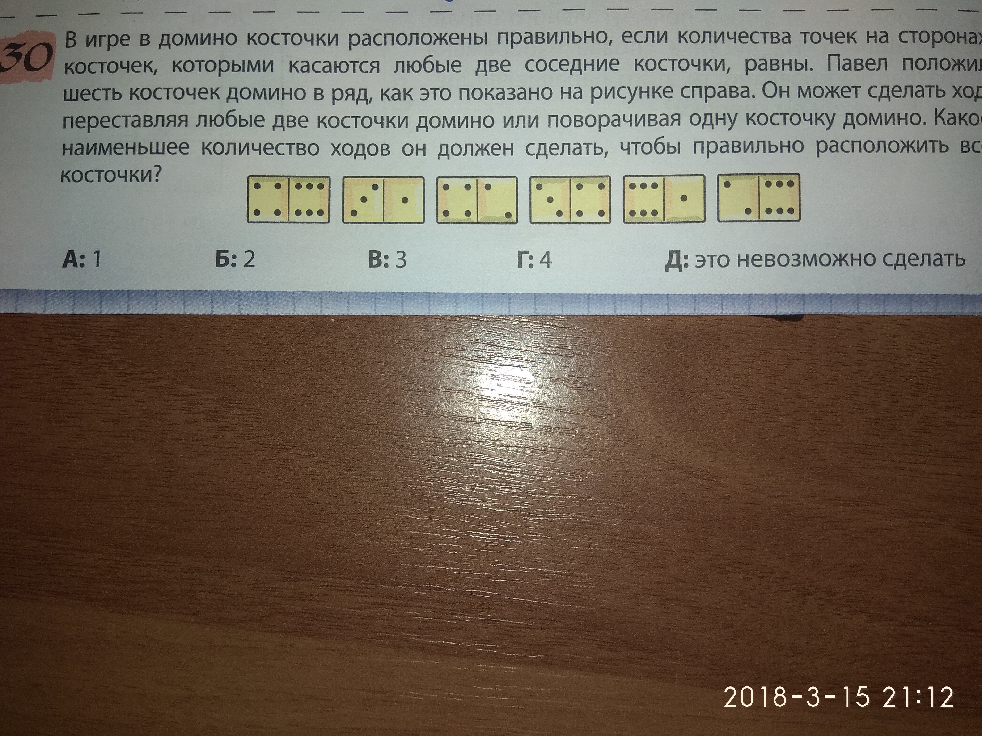 В игре в домино косточки расположены правильно , если количества точек на сторонах косточек , которыми касаются побые две соседние косточки , равны . Павел положил шесть косточек домино в ряд как это показано на рисунке справа . Он может сделать ход переставляя любые две косточки домино или поворачивая одну косточку домино . Какое наименьшее количество ходов он должен сделать чтобы правильно расположить все косточки ?