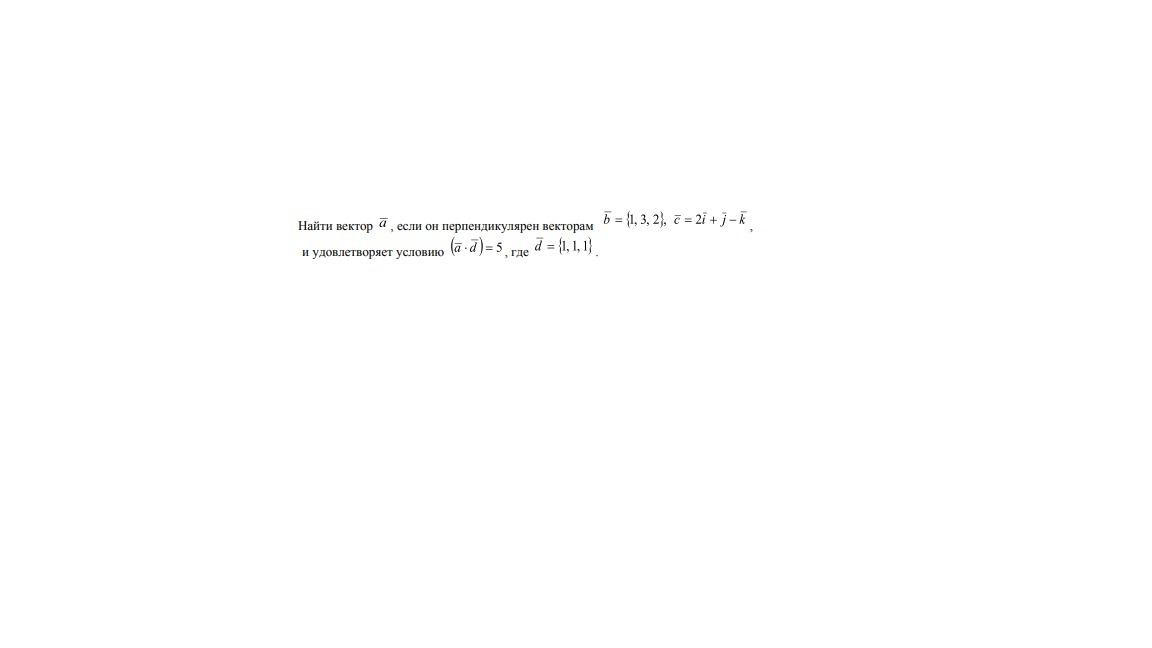 Найти вектор а, если он перпендикулярен b={1,3,2}, c=2i+j-k, и удолетворяет условию (a*d)=5, где d={1,1,1}
