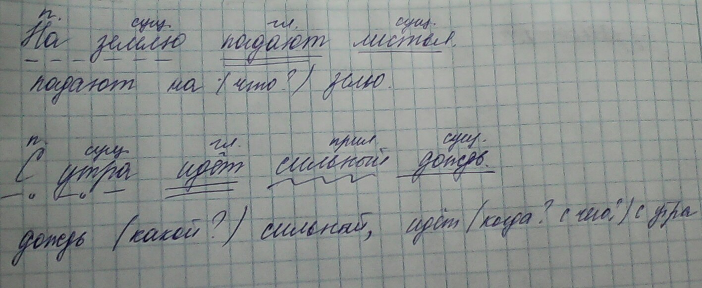а) Распространите предложения. Идёт дождь. Падают листья. Затенькала пеночка. б) Разберите предложения по членам предложения и частям речи. в) Выпишите словосочетания с вопросами.