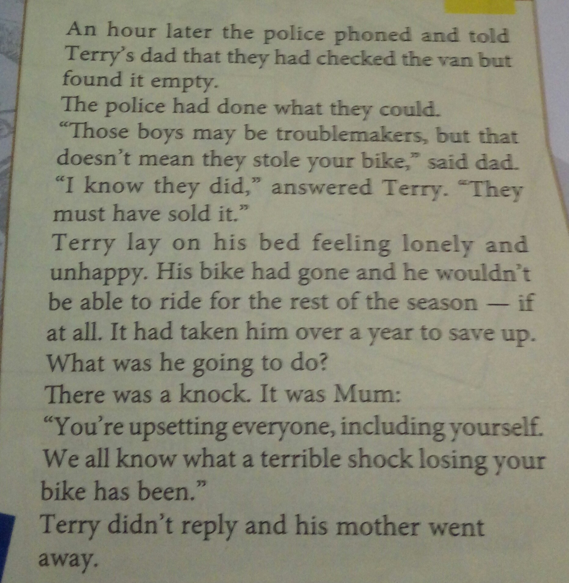 Терри лежал на кровати чувствую себя одиноко и несчастливо. Его велосипед был украден и он не смог бы кататься до конца сезона - если вообще сможет когда нибудь . Он копил больше года. Что он собирался делать?
