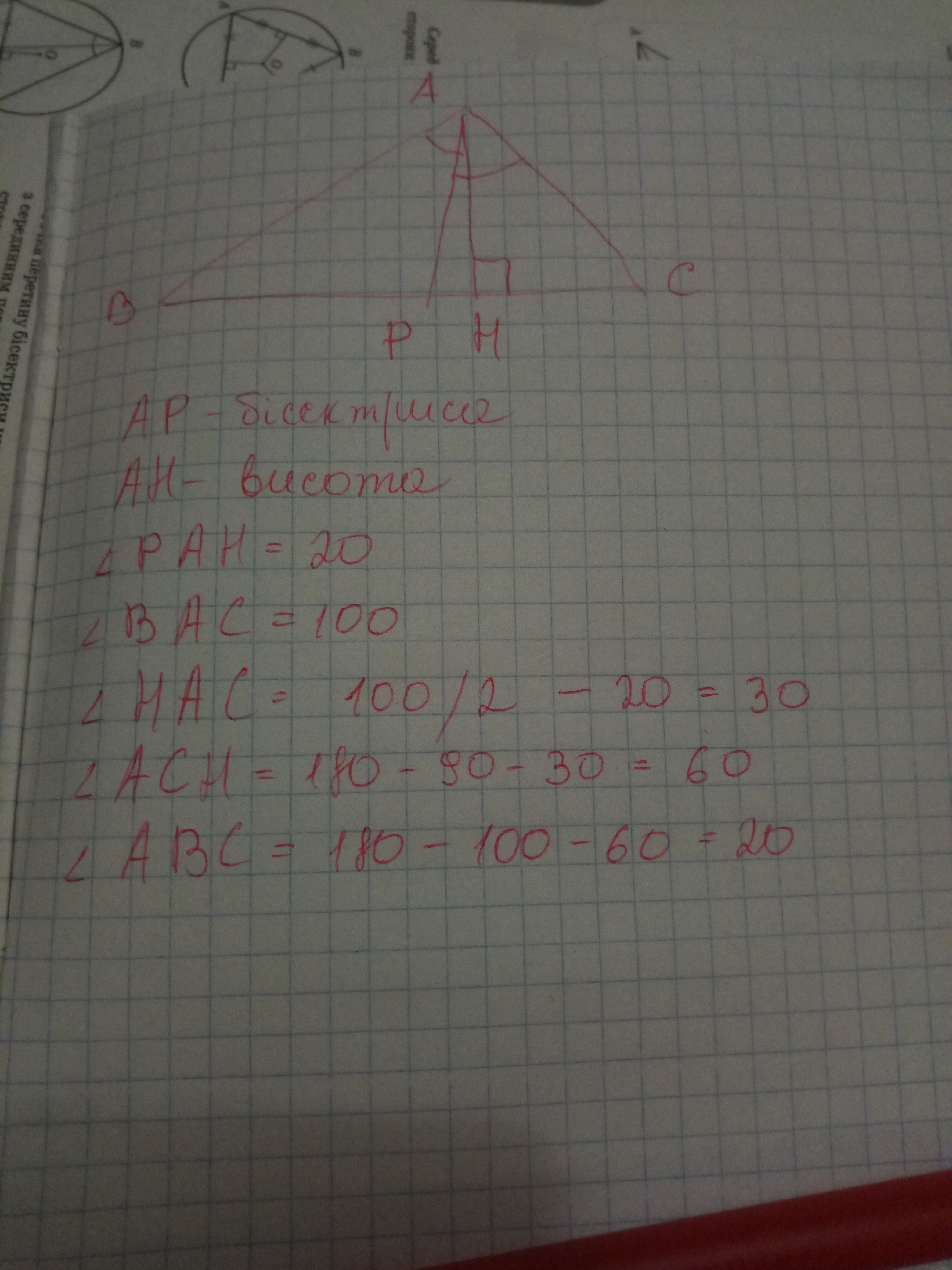 один з кутів трикутника дорівнює 100 градусів .висота та бісектриса проведені звершини цього кута утворюють кут 20 градусів Знайдіть невідомі кути