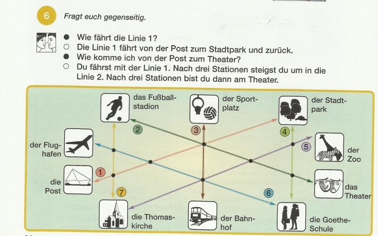 Du fährst mit der Linie 2. Nach einer Station steigst du in Linie 3 um. Nach einer Station sollst du in die Linie 6 umsteigen. ( или так :Nach einer Station steigst du in die Linie 3 um). Nach einer Station bist du an der Schule.