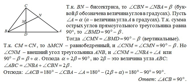 Высота CD и бисектрисса BN треугольника ABC пересекаются в точке M. Известно,что CM=CN.Найдите угол ACB.