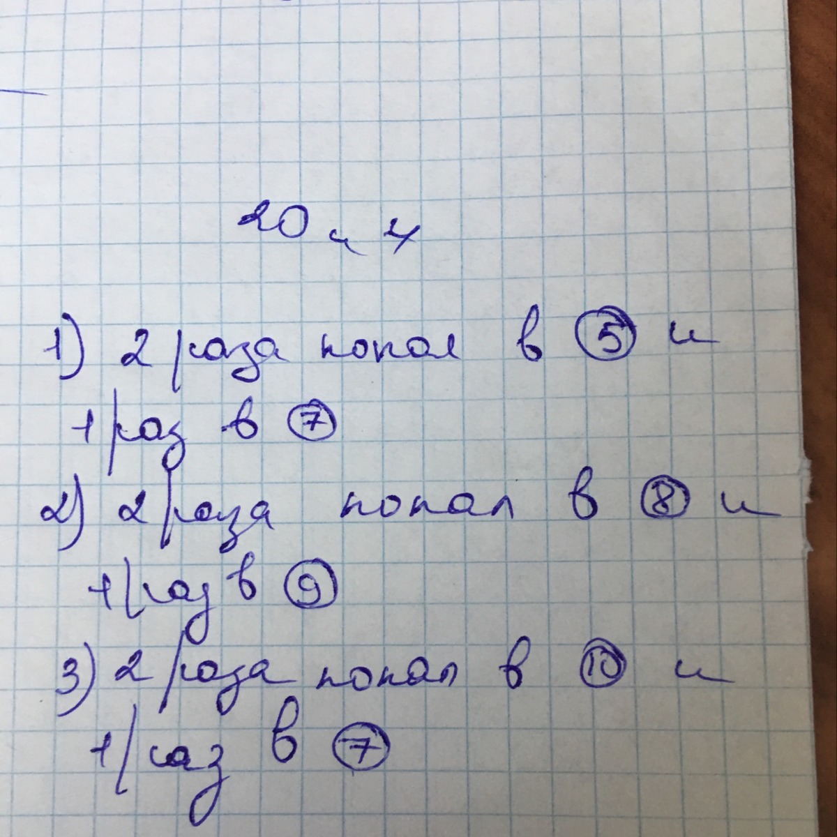При подготовке к Олимпиаде биатлонисты стреляют в мишень с кругами. В каждом круге числа от 1 до 10. В какой круг попадает спортсмен, столько очков и зачитывается. Один стрелок выстрелил три раза и набрал в сумме 27 очков. В какие круги он попал, если два выстрела в точности пришлись в одно место, а третий в другое? Изобрази два варианта ответа