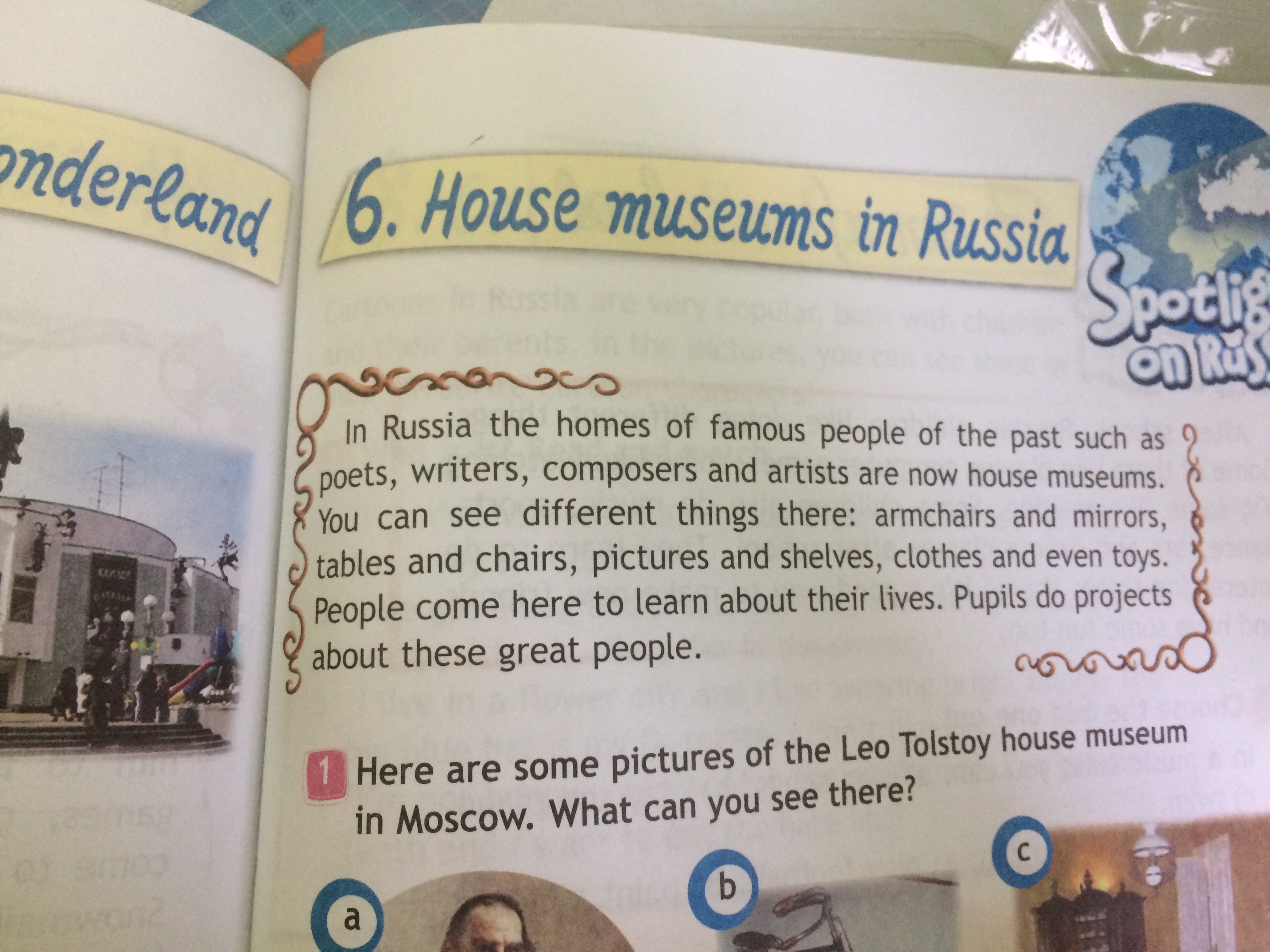 В России дома известных людей из прошлого, таких как поэты, писатели, композиторы и художники, теперь являются домашними музеями. Здесь можно увидеть разные вещи: кресла и зеркала, столы и стулья, картины и полки, одежду и даже игрушки. Люди приходят сюда, чтобы узнать о своей жизни. Ученики делают проекты об этих великих людях.